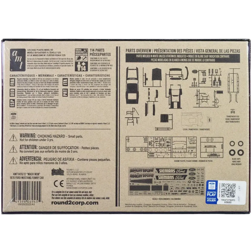 Brand new 1/25 scale plastic model kit of 1970 Ford Mustang Funny Car "Mach Won" (Skill 3) 1/25 plastic model kit by AMT. Brand new box. Black vinyl tires. Colorful decal artwork. Vintage style packaging. Officially licensed product. Chrome plated small parts. FoMoCo 427 cu. in. engine. Contains 114 detailed parts. Rear spoiler/airfoil and chute. Choice of several front end treatments. Paint and cement required (not included). Manufacturer's original unopened packaging. Parts molded in WHITE, unless otherwise indicated.