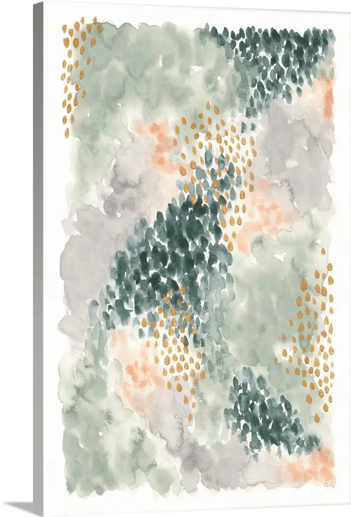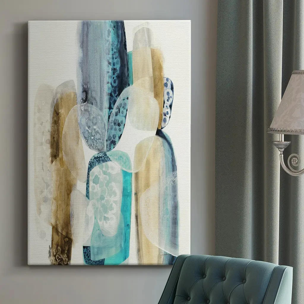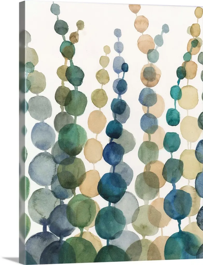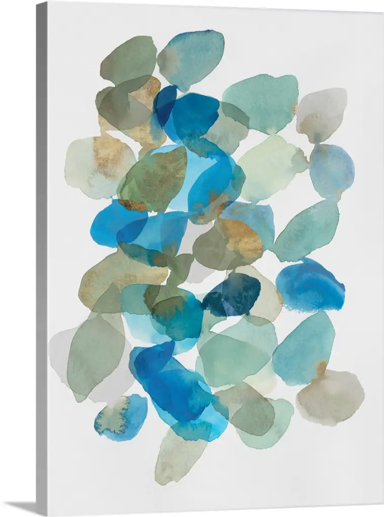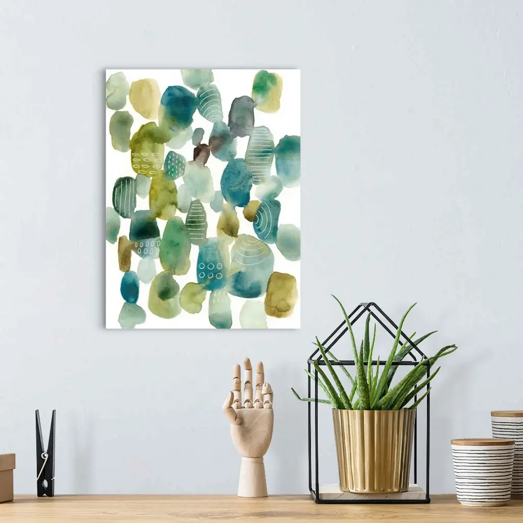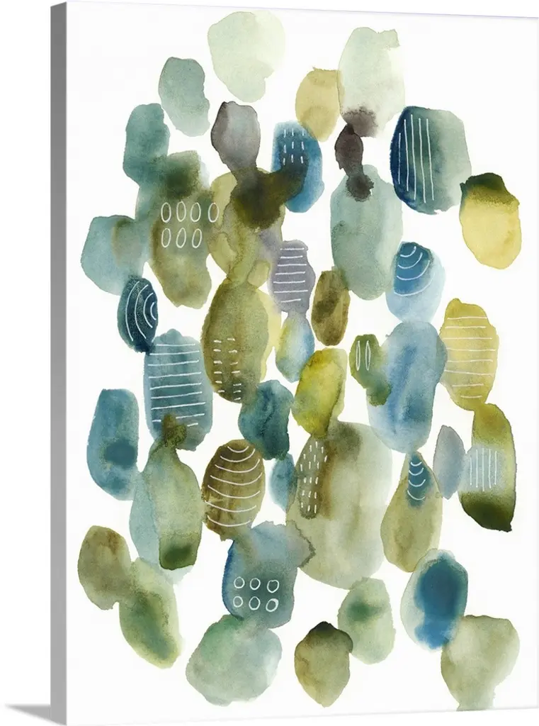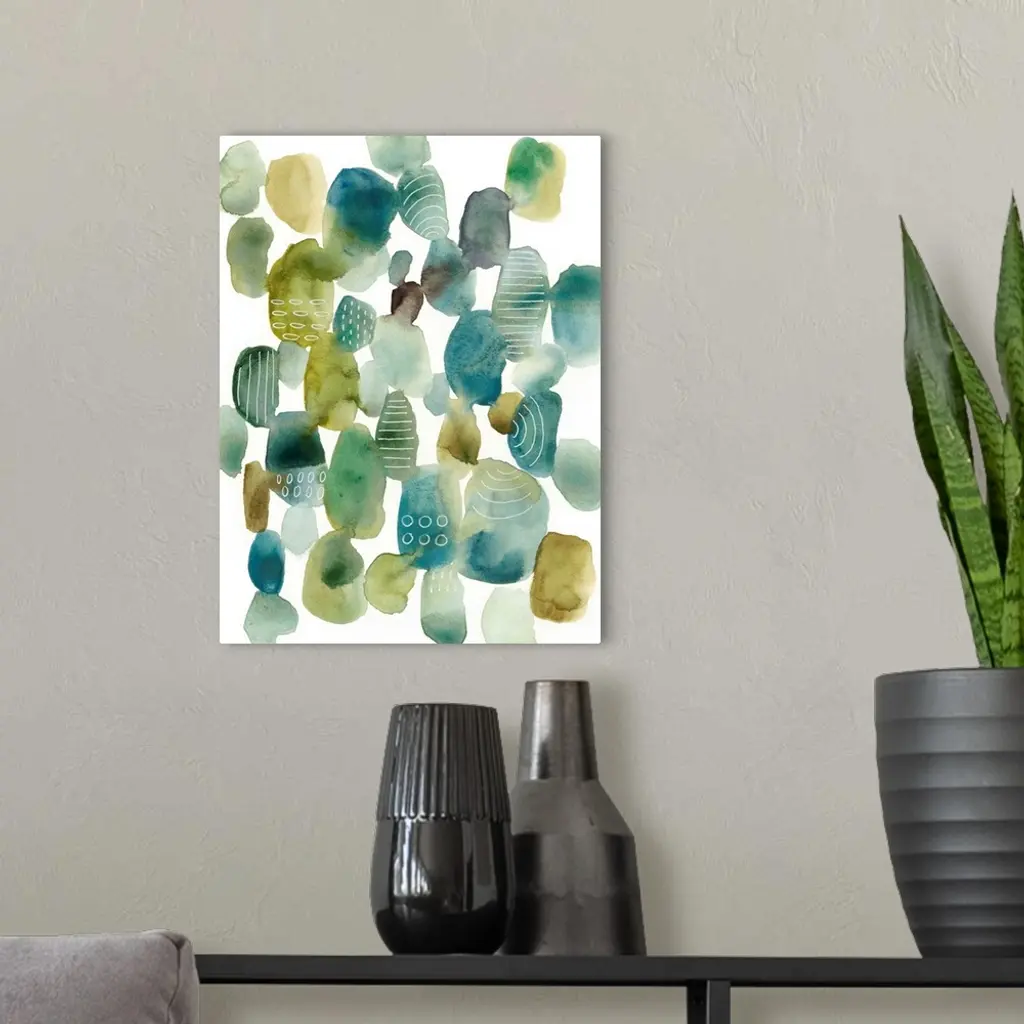 This contemporary artwork contains blue and green pebbles of color with some that are decorated with patterns of white lines.
