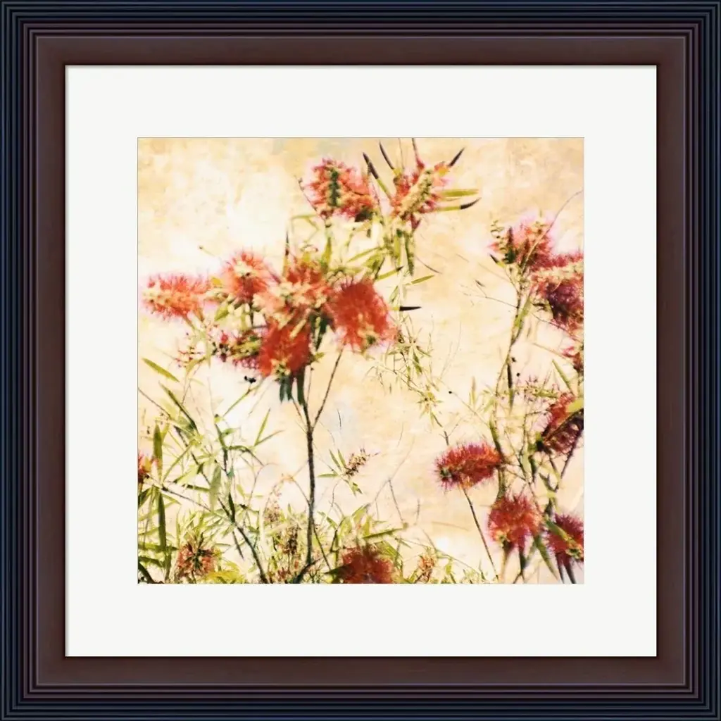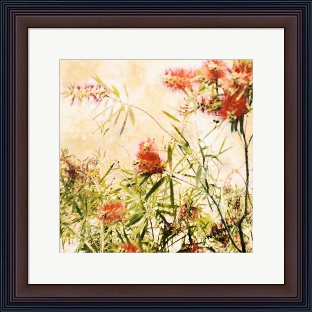 Bottle Brush III by Skip Nall is a high quality piece of framed artwork. The finished size of this piece is 22" X 22". It has a Brown Finish Stepped Front frame, is single matted and finished with high quality Acrylic Plexiglass.