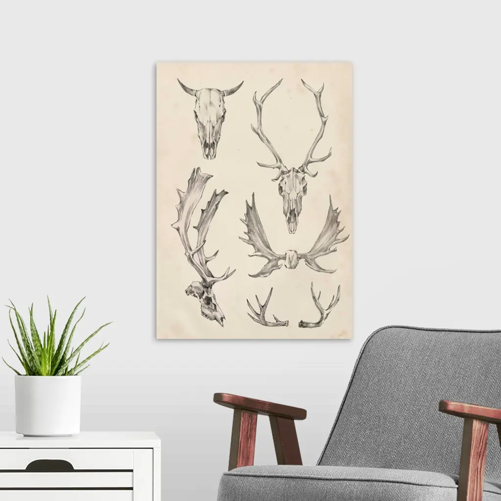 Contemporary scientific illustrative artwork of animal skull horns and antlers.