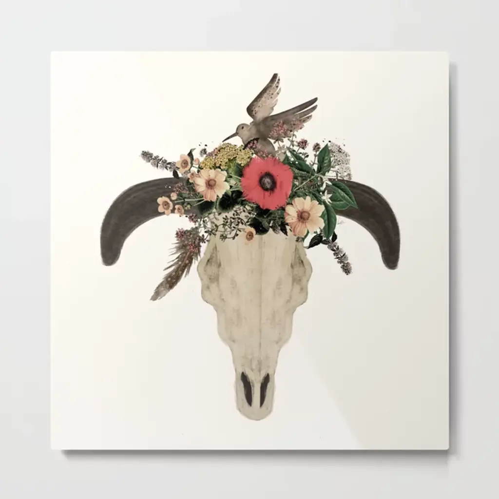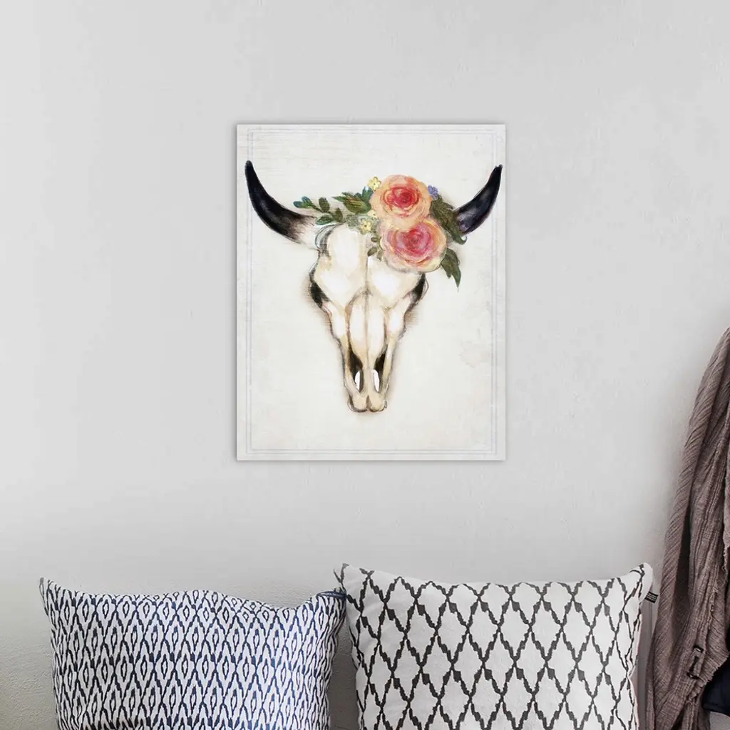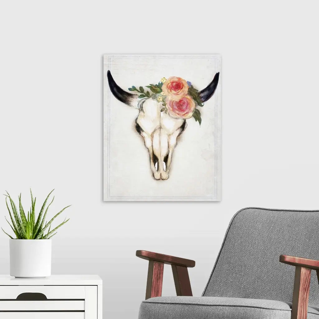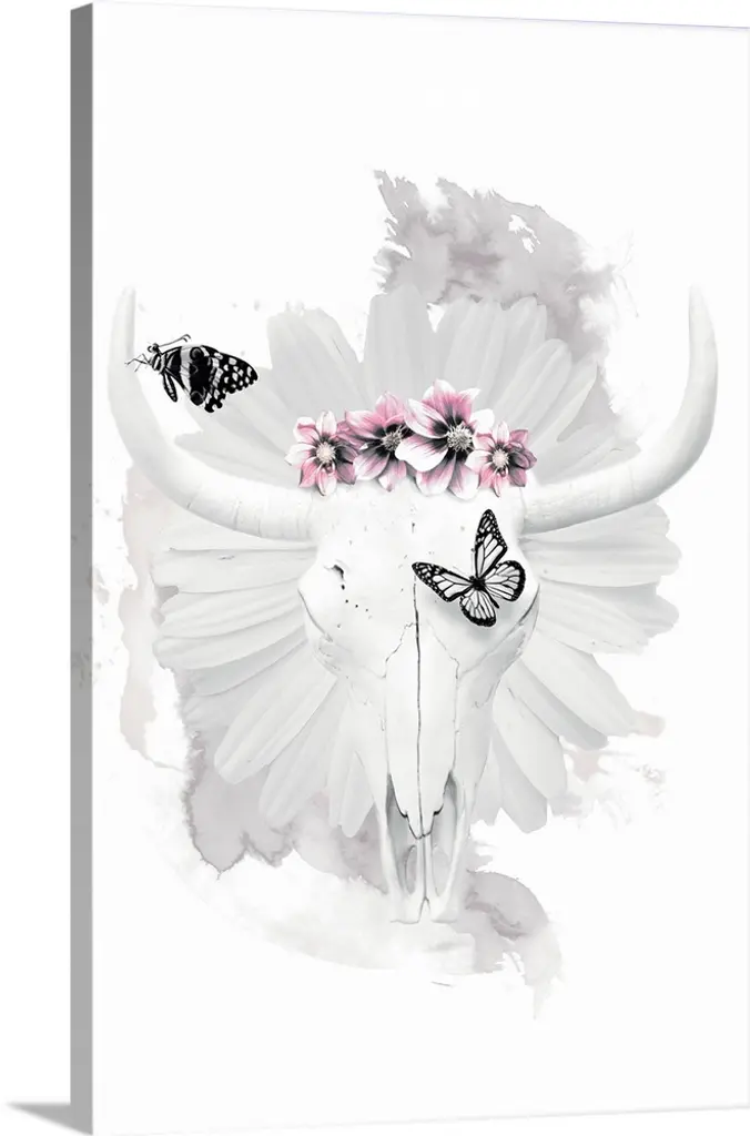 Decorative digital art piece of a bull skull with flowers on the top.
