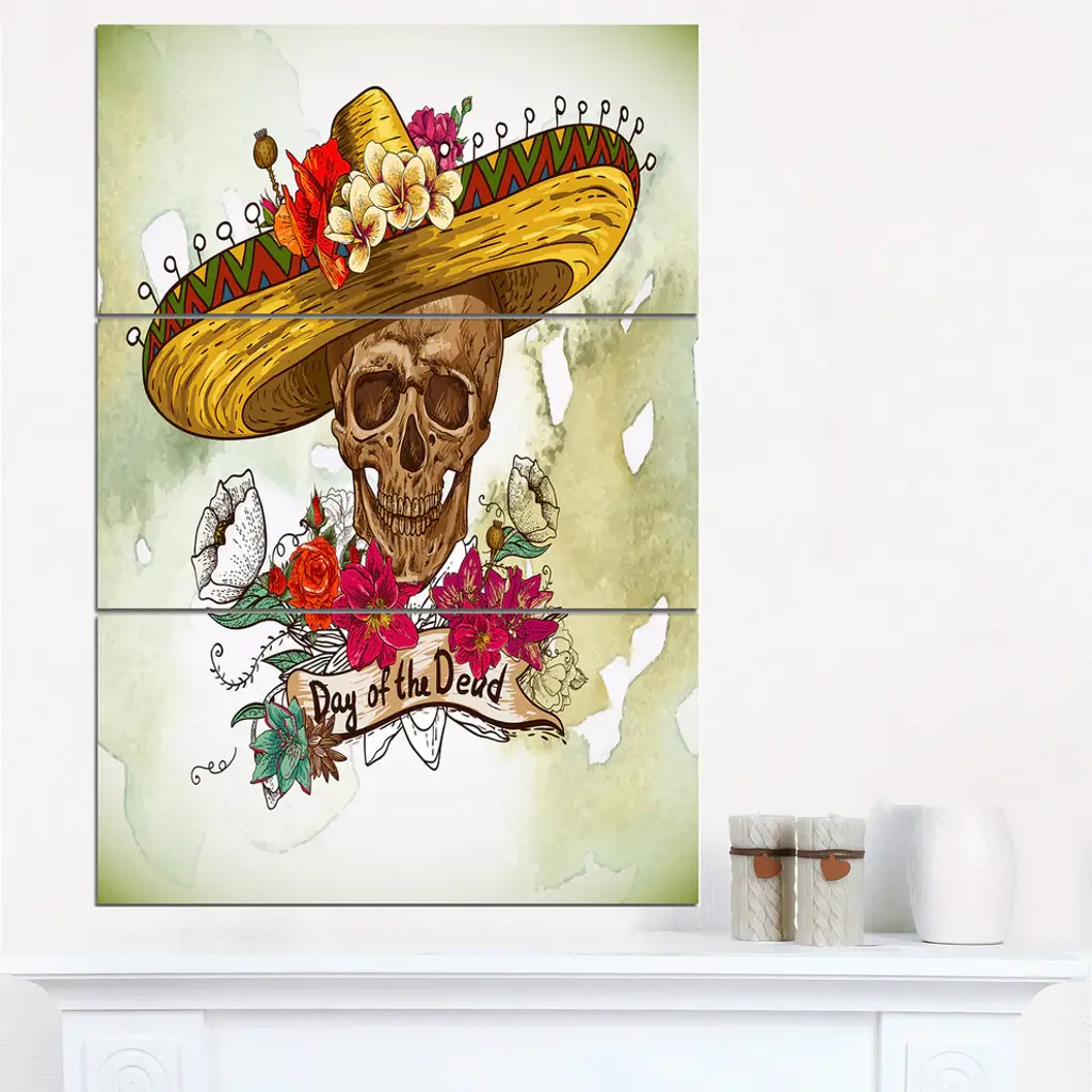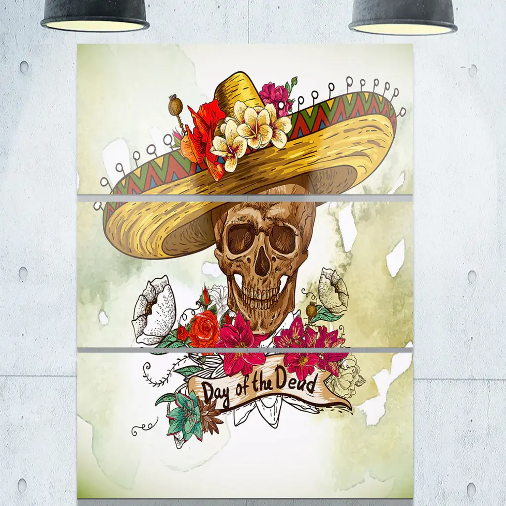 "Skull In Sombrero With Flowers" Digital Metal Wall Art, 3 Panels, 28"x36"