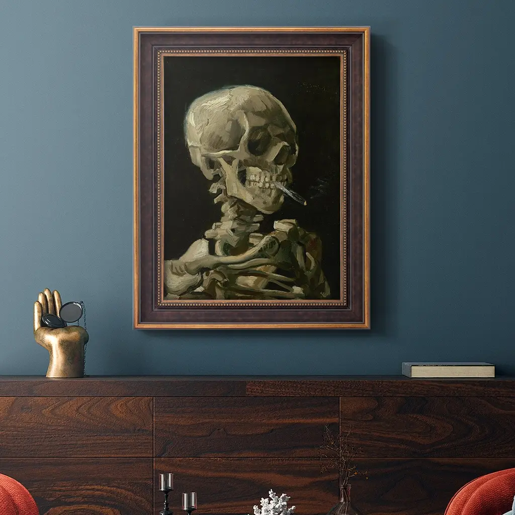 Skull of a Skeleton with Burning Cigarette Premium Framed Canvas- Ready to Hang A Premium Framed Canvas created to last. Framed in distressed wood and available in an array of sizes and colors Featuring a beveled a solid wood stretcher bar, each piece comes ready to hand 3 SIZES AVAILABLE 16''X20'' - Overall Size 18'X27'' - Overall Size 24''x36'' - Overall Size Each piece is made to order. Each piece comes with hanging hardware. Made in the USA Ready to Hang Giclee Paper Print Acrylic Glass Beveled Matt Board