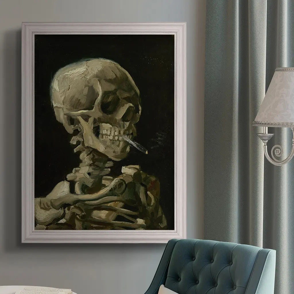 Skull of a Skeleton with Burning Cigarette Premium Framed Canvas- Ready to Hang A Premium Framed Canvas created to last. Framed in distressed wood and available in an array of sizes and colors Featuring a beveled a solid wood stretcher bar, each piece comes ready to hand 3 SIZES AVAILABLE 16''X20'' - Overall Size 18'X27'' - Overall Size 24''x36'' - Overall Size Each piece is made to order. Each piece comes with hanging hardware. Made in the USA Ready to Hang Giclee Paper Print Acrylic Glass Beveled Matt Board