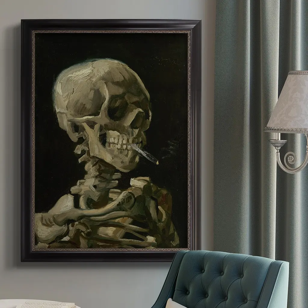 Skull of a Skeleton with Burning Cigarette Premium Framed Canvas- Ready to Hang A Premium Framed Canvas created to last. Framed in distressed wood and available in an array of sizes and colors Featuring a beveled a solid wood stretcher bar, each piece comes ready to hand 3 SIZES AVAILABLE 16''X20'' - Overall Size 18'X27'' - Overall Size 24''x36'' - Overall Size Each piece is made to order. Each piece comes with hanging hardware. Made in the USA Ready to Hang Giclee Paper Print Acrylic Glass Beveled Matt Board