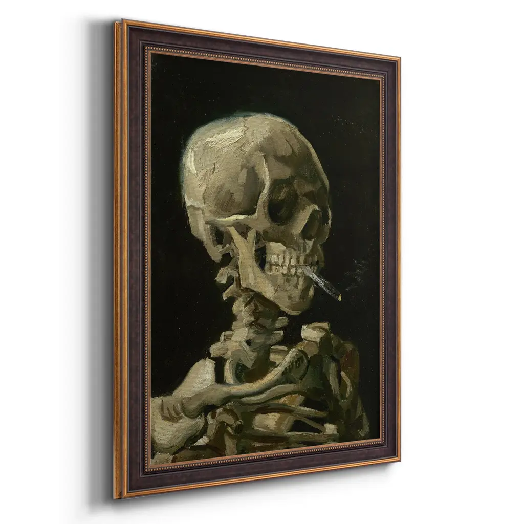Skull of a Skeleton with Burning Cigarette Premium Framed Canvas- Ready to Hang A Premium Framed Canvas created to last. Framed in distressed wood and available in an array of sizes and colors Featuring a beveled a solid wood stretcher bar, each piece comes ready to hand 3 SIZES AVAILABLE 16''X20'' - Overall Size 18'X27'' - Overall Size 24''x36'' - Overall Size Each piece is made to order. Each piece comes with hanging hardware. Made in the USA Ready to Hang Giclee Paper Print Acrylic Glass Beveled Matt Board