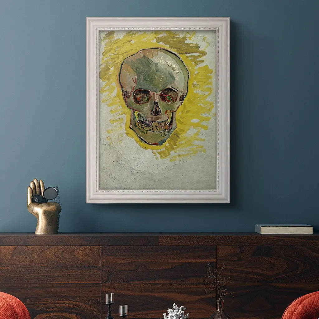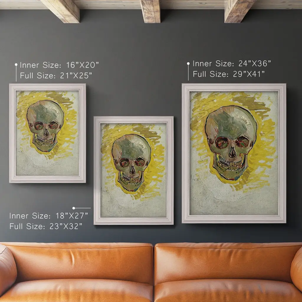 SKULL Premium Framed Canvas- Ready to Hang A Premium Framed Canvas created to last. Framed in distressed wood and available in an array of sizes and colors Featuring a beveled a solid wood stretcher bar, each piece comes ready to hand 3 SIZES AVAILABLE 16''X20'' - Overall Size 18'X27'' - Overall Size 24''x36'' - Overall Size Each piece is made to order. Each piece comes with hanging hardware. Made in the USA Ready to Hang Giclee Paper Print Acrylic Glass Beveled Matt Board