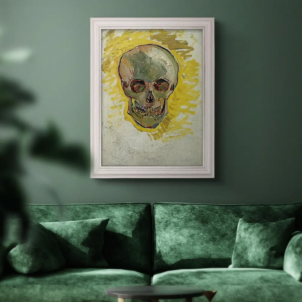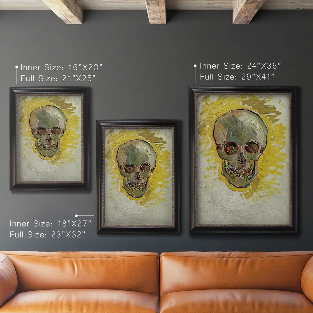 SKULL Premium Framed Canvas- Ready to Hang A Premium Framed Canvas created to last. Framed in distressed wood and available in an array of sizes and colors Featuring a beveled a solid wood stretcher bar, each piece comes ready to hand 3 SIZES AVAILABLE 16''X20'' - Overall Size 18'X27'' - Overall Size 24''x36'' - Overall Size Each piece is made to order. Each piece comes with hanging hardware. Made in the USA Ready to Hang Giclee Paper Print Acrylic Glass Beveled Matt Board