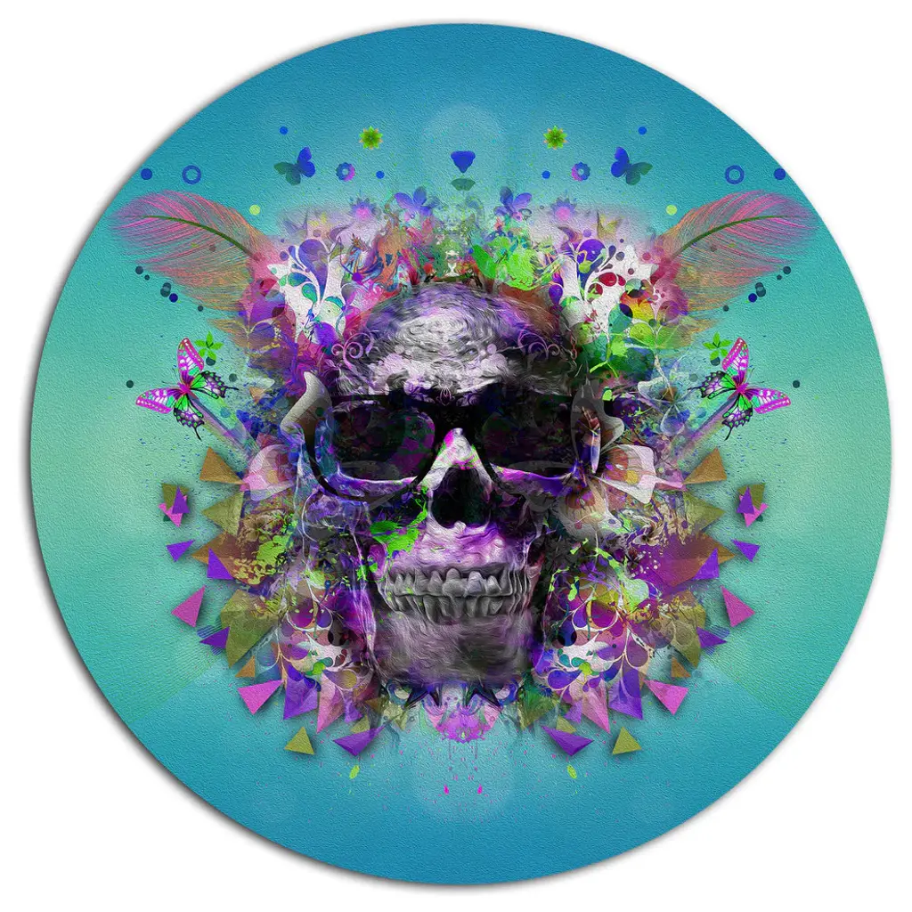 Bring Contemporary Abstraction to your home with this large Circle Metal wall art. This Skull with Glasses and Paint Splashes Metal Artwork makes it the focal point of any room or office. - White Gloss Coating ensures colors are extra vibrant with light reflection.- Aluminum grade Sheet Metal with 1 inch mounting frame on the back giving the illusion that the artwork is floating on the wall..- Mounting Brackets are included along with instructions.- High Quality Digital images are created directly into a glossy aluminum panel producing a stunning and captivating print into the glossy finish of the metal.- Water, Fire and Scratch resistant HD Aluminum panels.- Looks better than any photo paper and guaranteed to last at least 20 years- Easy to clean with a microfiber cloth. Colors are far superior to regular Canvas Art. - Easy to Hang