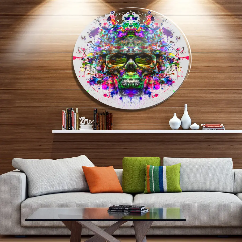 Bring Contemporary Abstraction to your home with this large Circle Metal wall art. This Skull with Glasses and Paint Splashes Metal Artwork makes it the focal point of any room or office. - White Gloss Coating ensures colors are extra vibrant with light reflection.- Aluminum grade Sheet Metal with 1 inch mounting frame on the back giving the illusion that the artwork is floating on the wall..- Mounting Brackets are included along with instructions.- High Quality Digital images are created directly into a glossy aluminum panel producing a stunning and captivating print into the glossy finish of the metal.- Water, Fire and Scratch resistant HD Aluminum panels.- Looks better than any photo paper and guaranteed to last at least 20 years- Easy to clean with a microfiber cloth. Colors are far superior to regular Canvas Art. - Easy to Hang