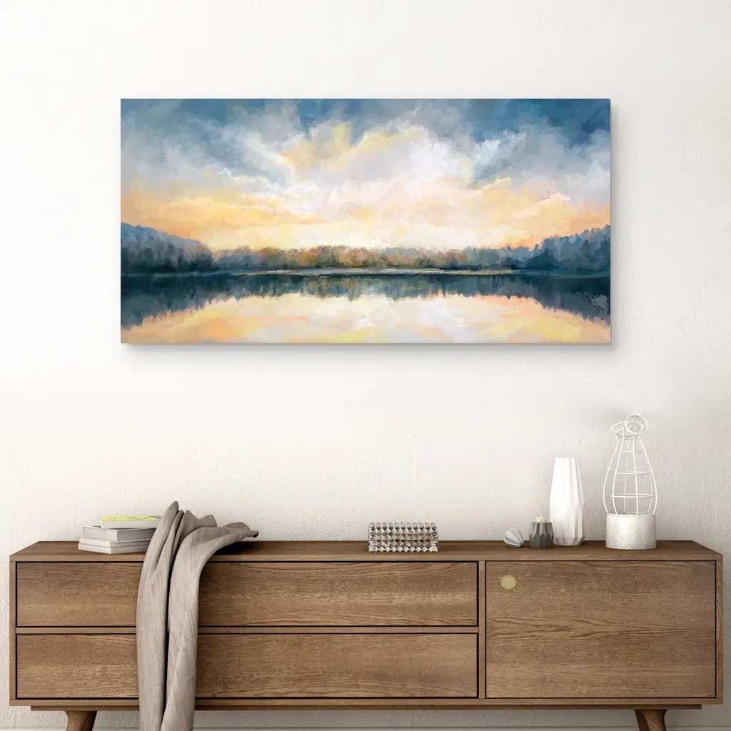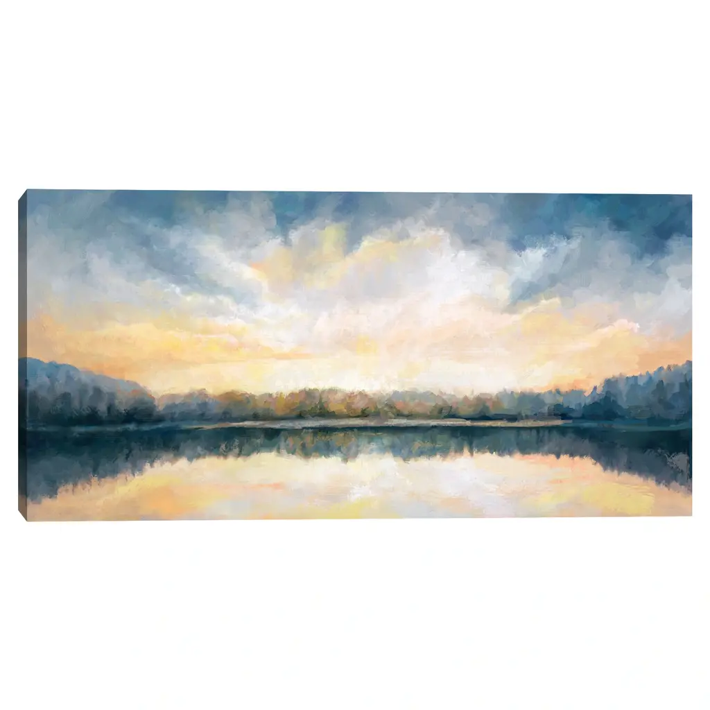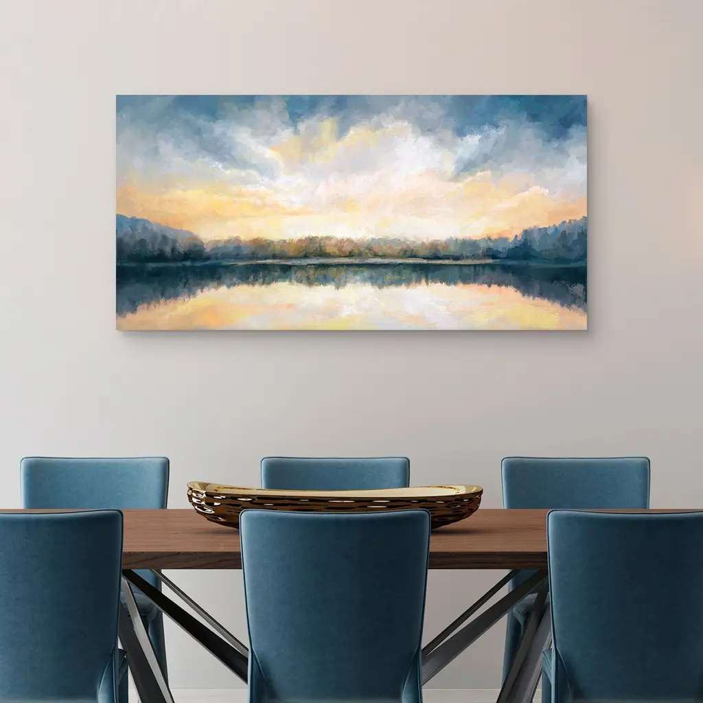 The glowing heavens reflect off a mirror-like lake that sits placidly surrounded by a field of trees. Radiant shades of yellow and orange shine down from the rolling white and gray cloud cover. Studio Arts canvas art print Skylights comes ready-to-hang on a wall in your favorite space.