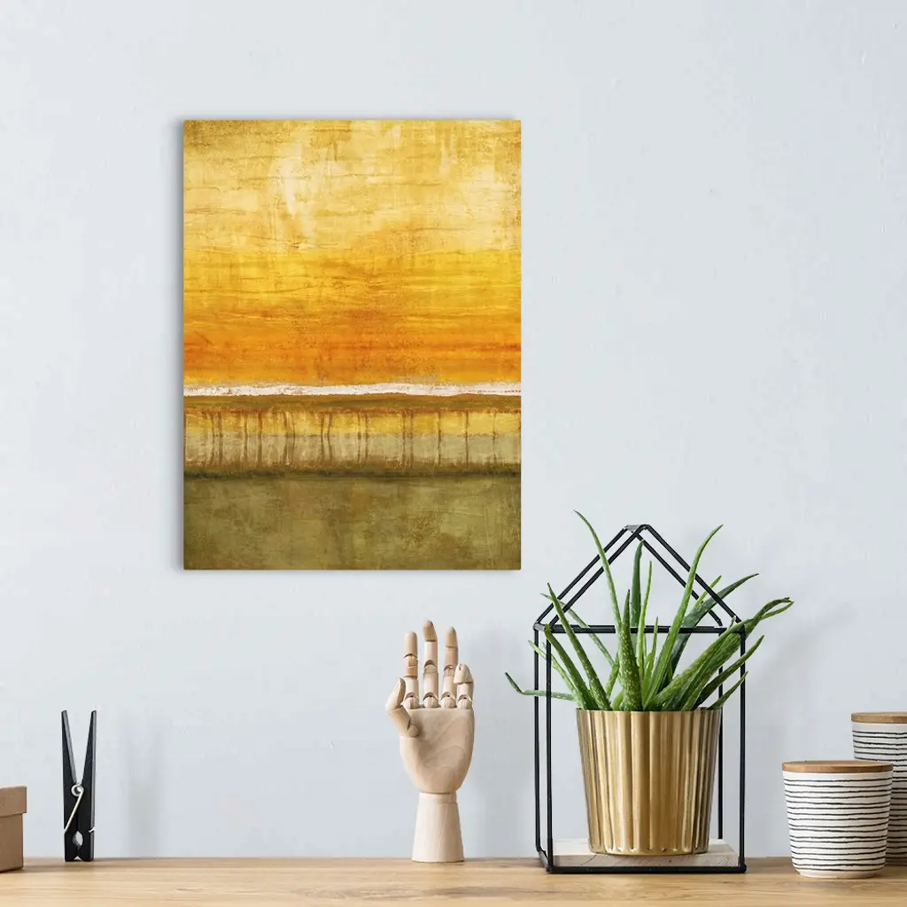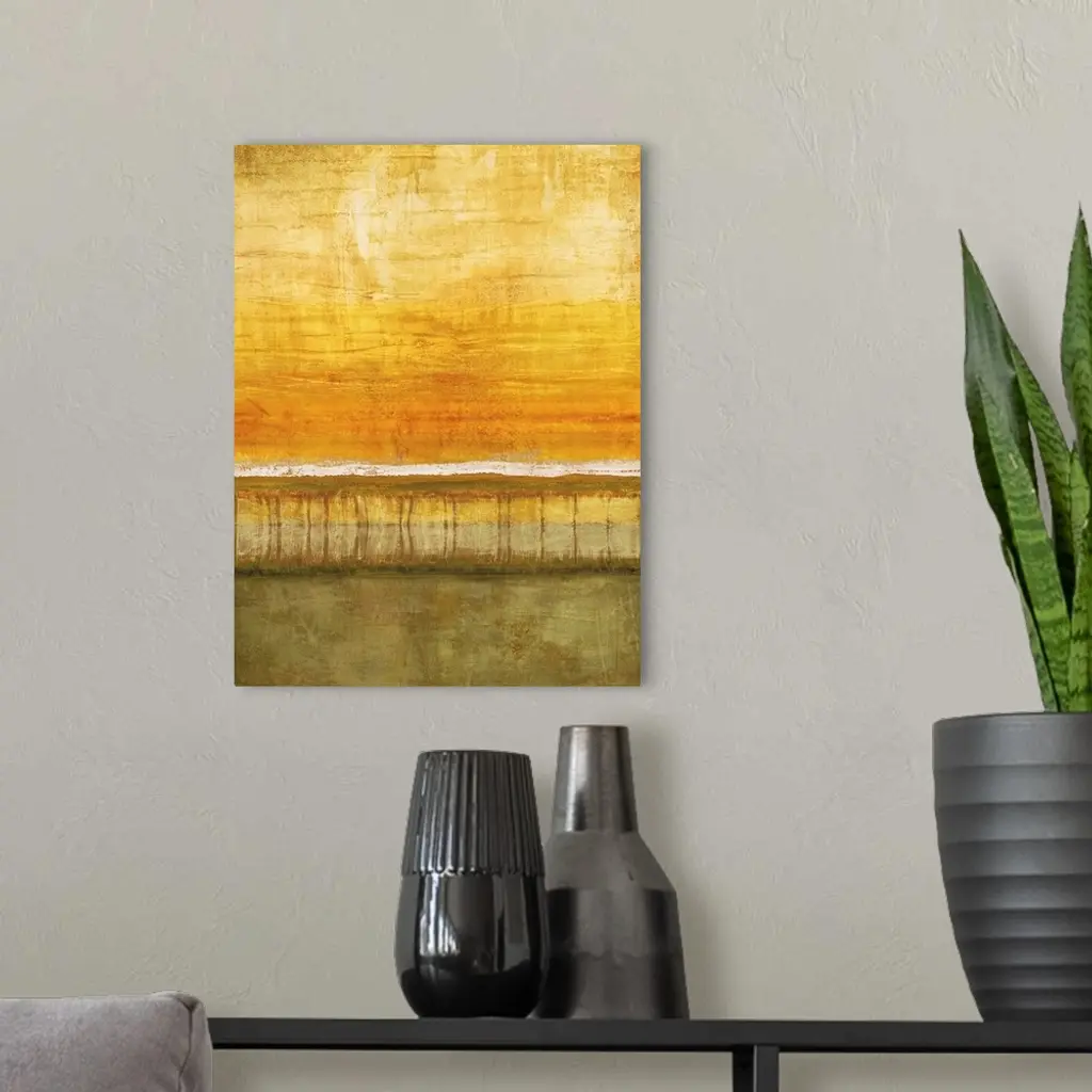 Abstract painting with a white horizon line and a yellow and orange sky with olive green below.