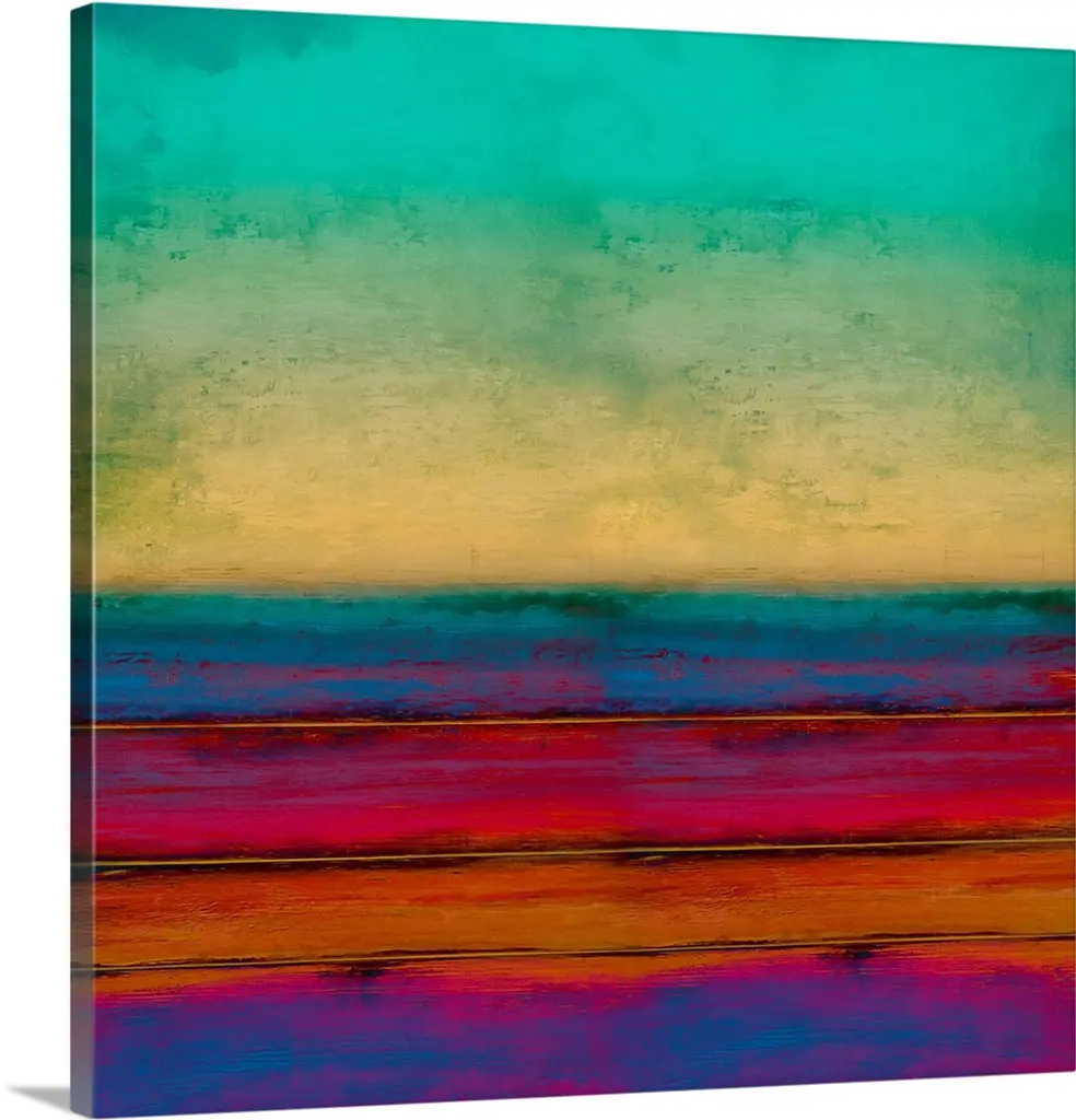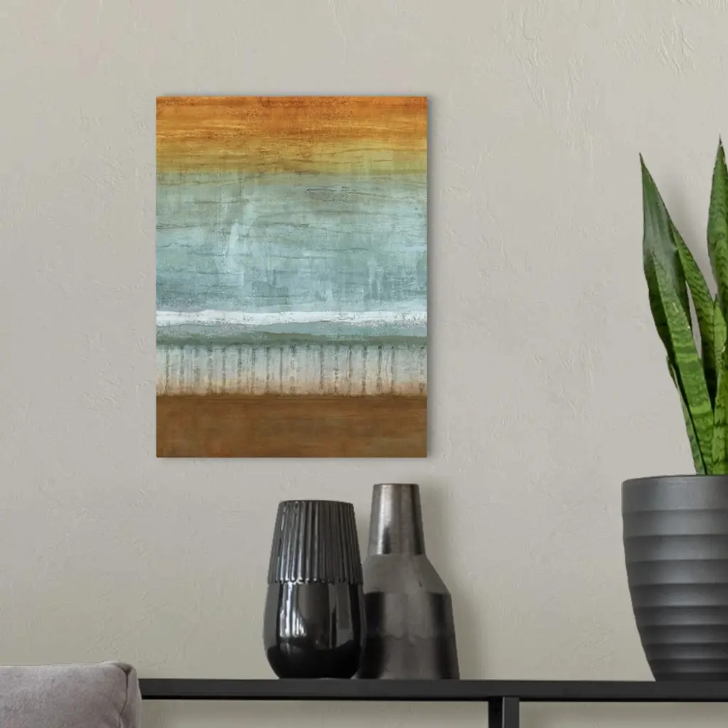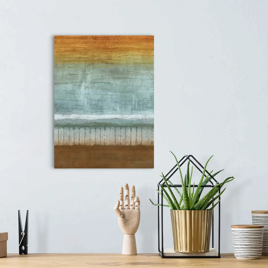 Abstract painting with a white horizon line and an orange and blue sky with brown below.