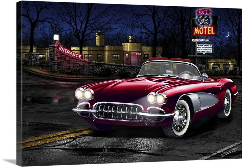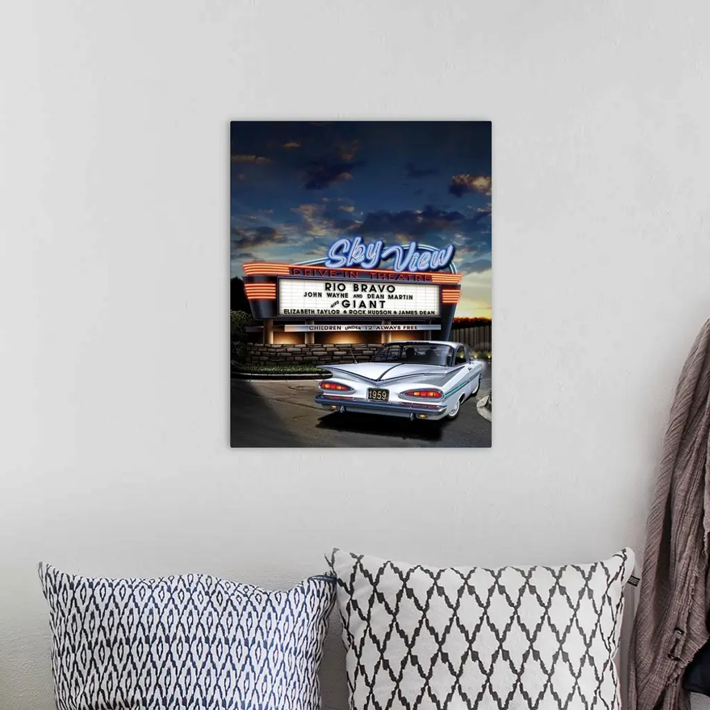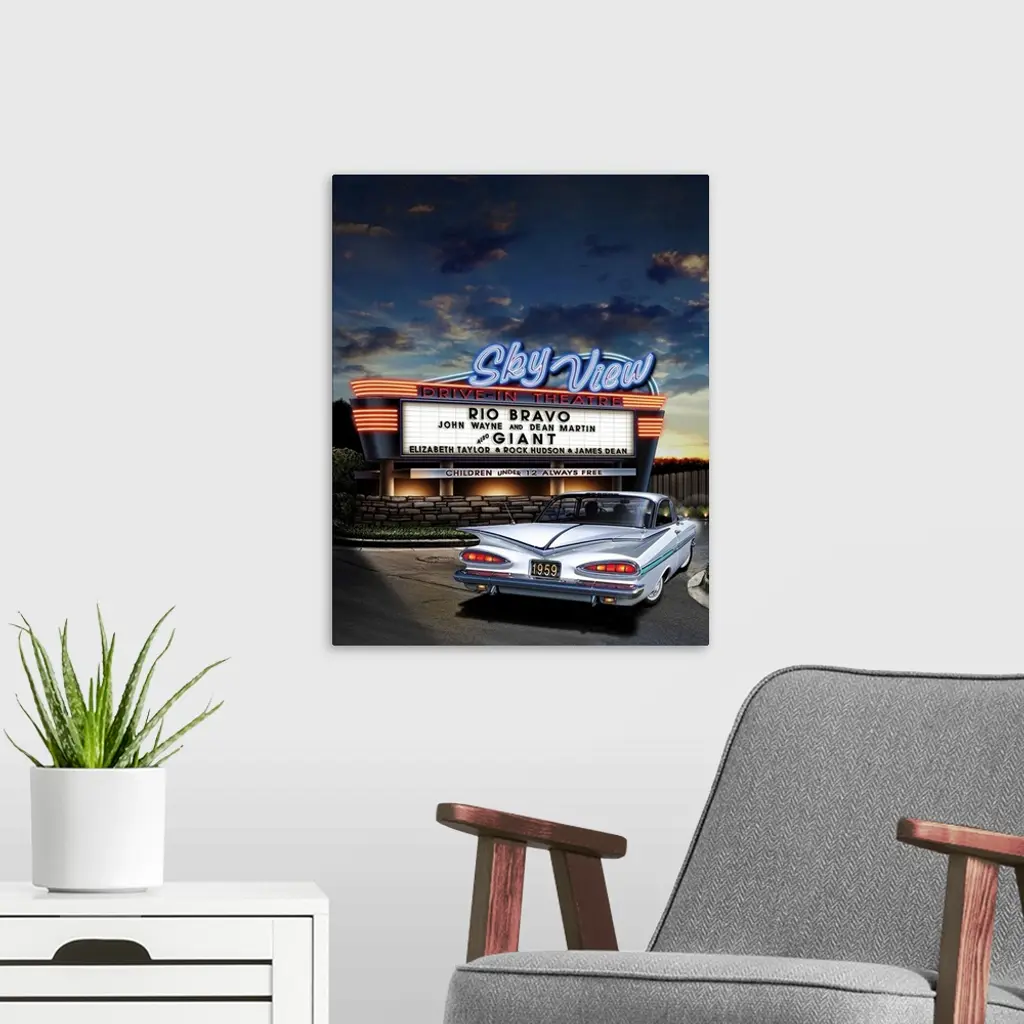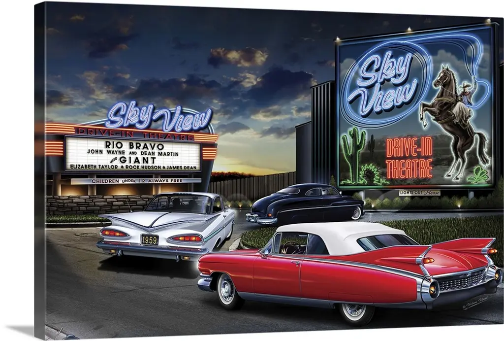 Digital art painting of the Sky View drive-in theater playing Rio Bravo and Giant, with a classic white car filing into the show.