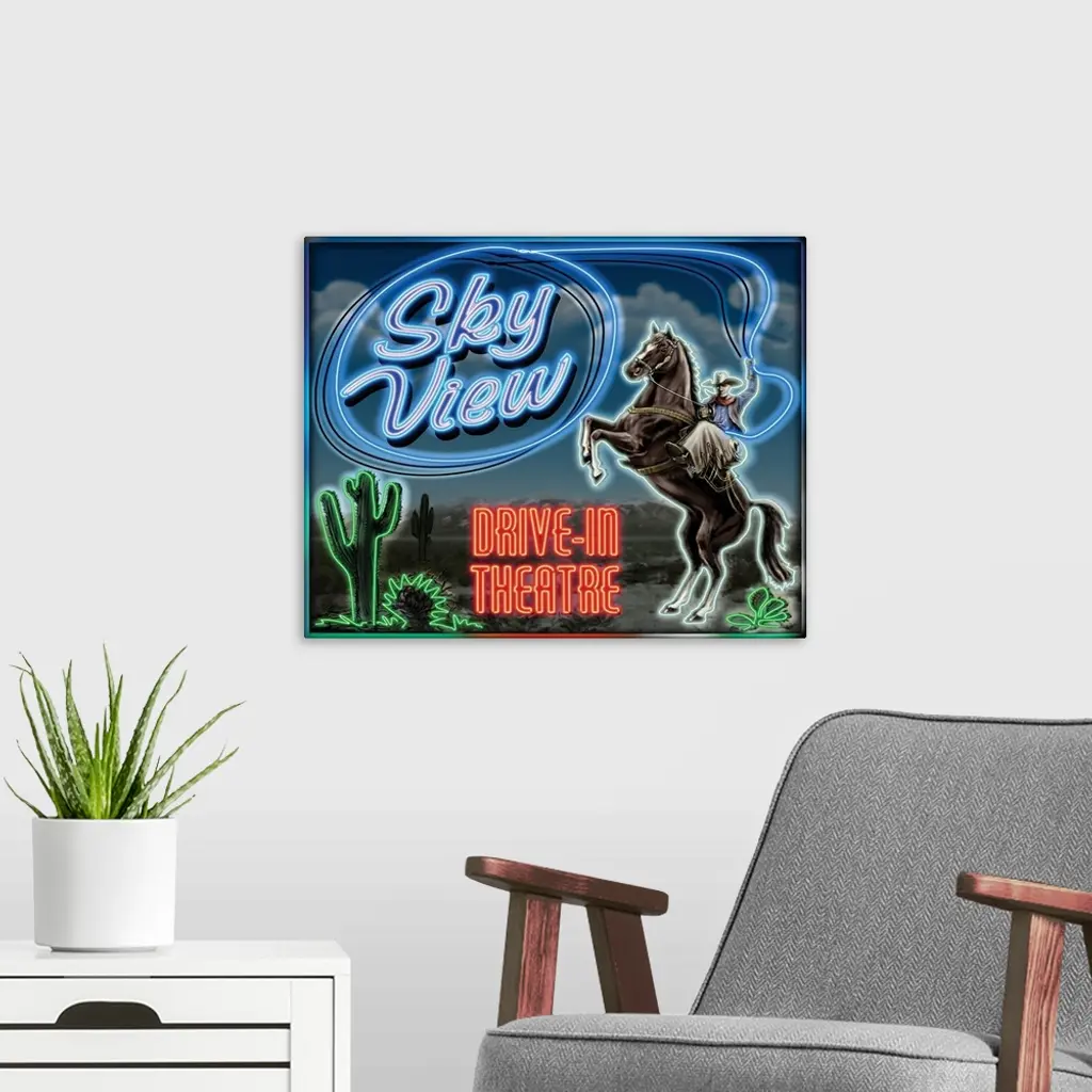 Digital artwork of the Sky View drive-in theater neon sign.