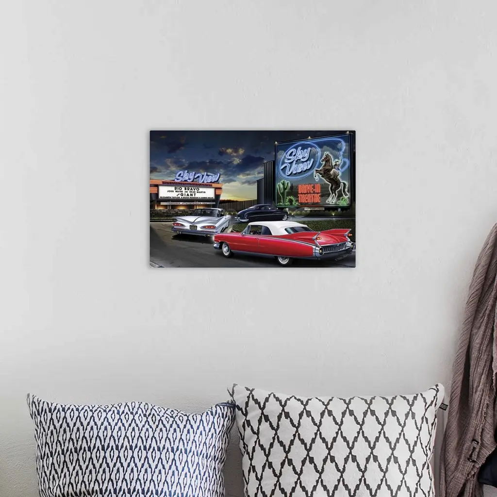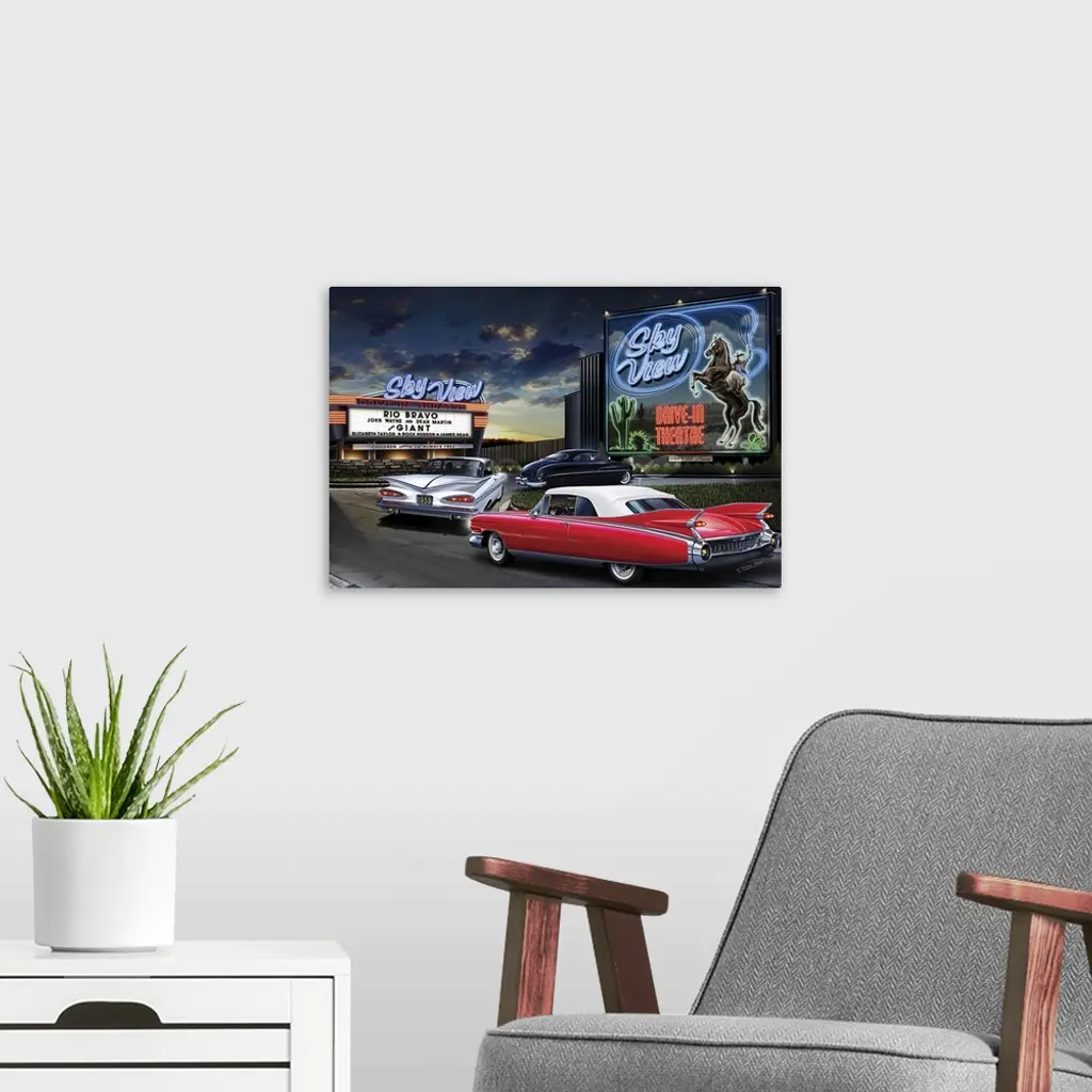 Digital art painting of the Sky View drive-in theater, playing Rio Bravo and Giant, with classic cars filing into the show, by Helen Flint.