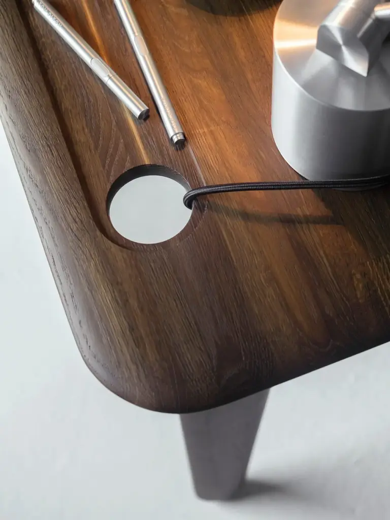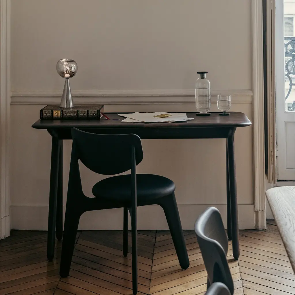 The Slab desk, part of the Slab collection, showcases sustainably sourced oak with rounded edges and a brushed surface that exposes the wood's natural grain. Featuring a cable management hole and a groove for pens, it’s the perfect addition to any office space, ideal for laptops, makeup, sketching, or Instagram.