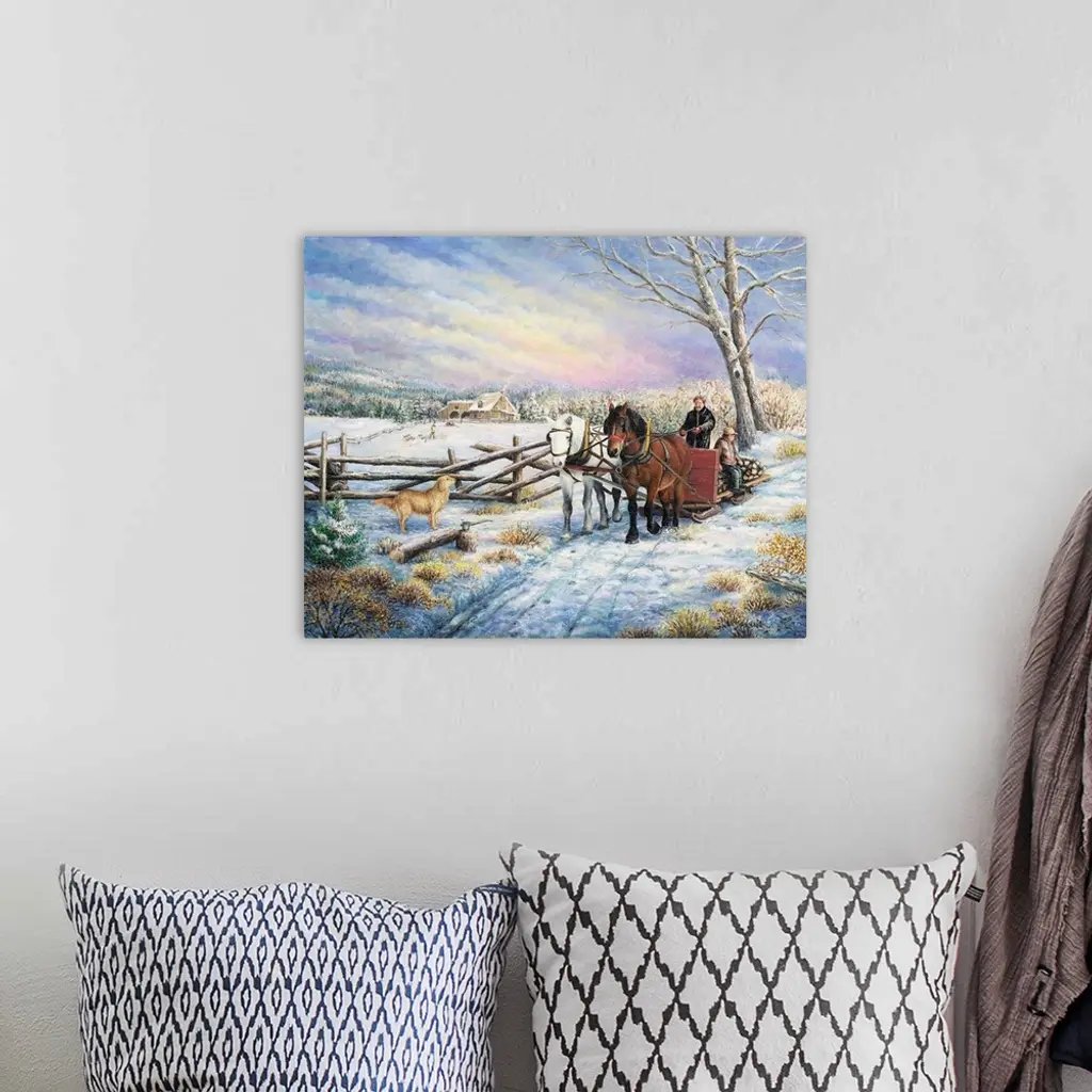 Contemporary artwork of couple of people on a sleigh being pulled by two horses past a fence.