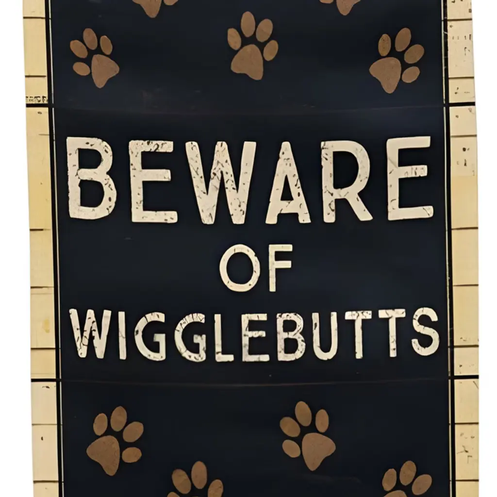 Add a fun and playful touch to your garden with the "Beware of Wigglebutts" Garden Flag. This double-sided flag features a black background with a wood-like border and paw print accents, creating a charming design that captures the joyful spirit of your furry friends. The flag reads, "Beware of Wigglebutts" in distressed brown text, making it a perfect addition to any dog lover's yard. Made from silky-soft, sturdy 2-ply polyester with a sun block backing, this flag is designed to resist weather, mold, mildew, and UV fading, ensuring it stays vibrant season after season. The flag is machine washable for easy cleaning and fits most standard garden flagpoles (pole not included).