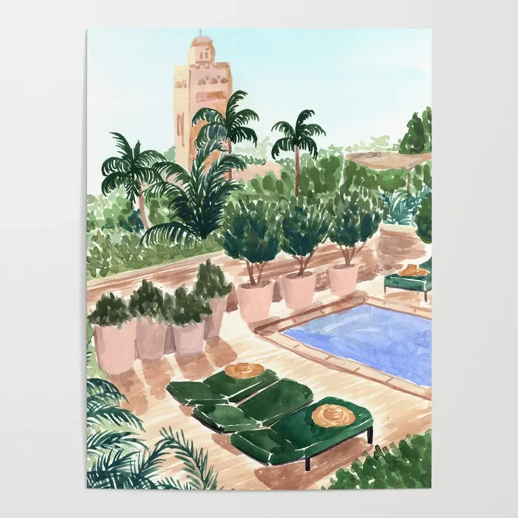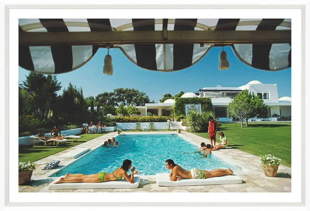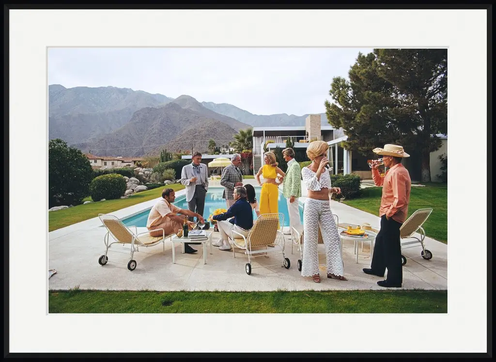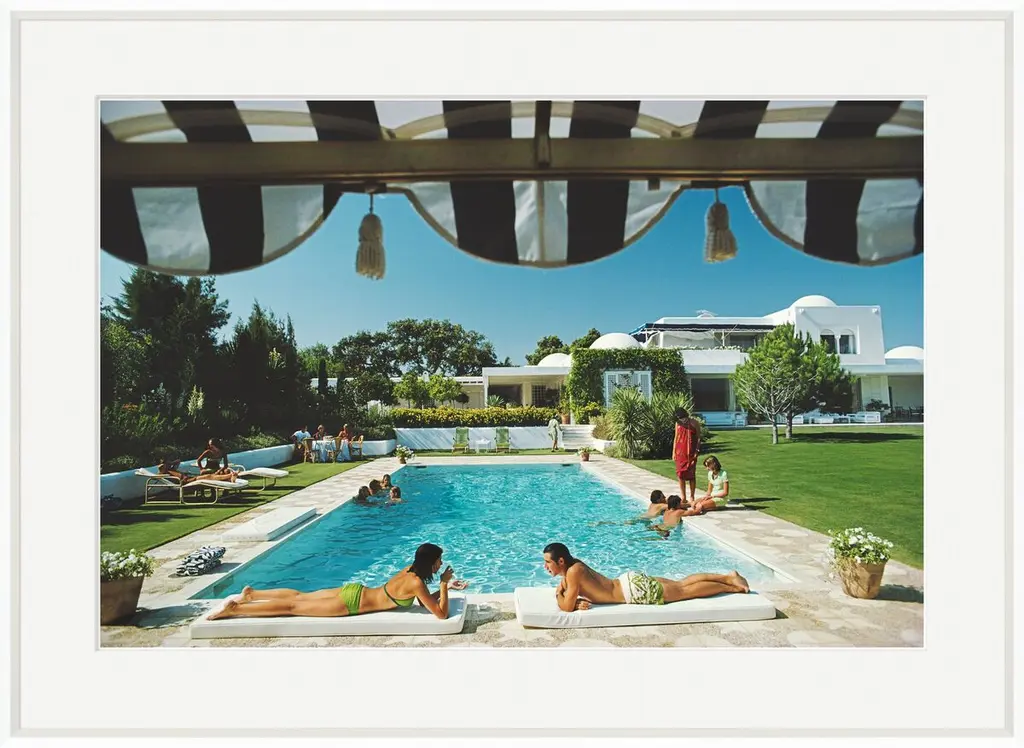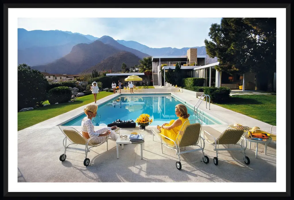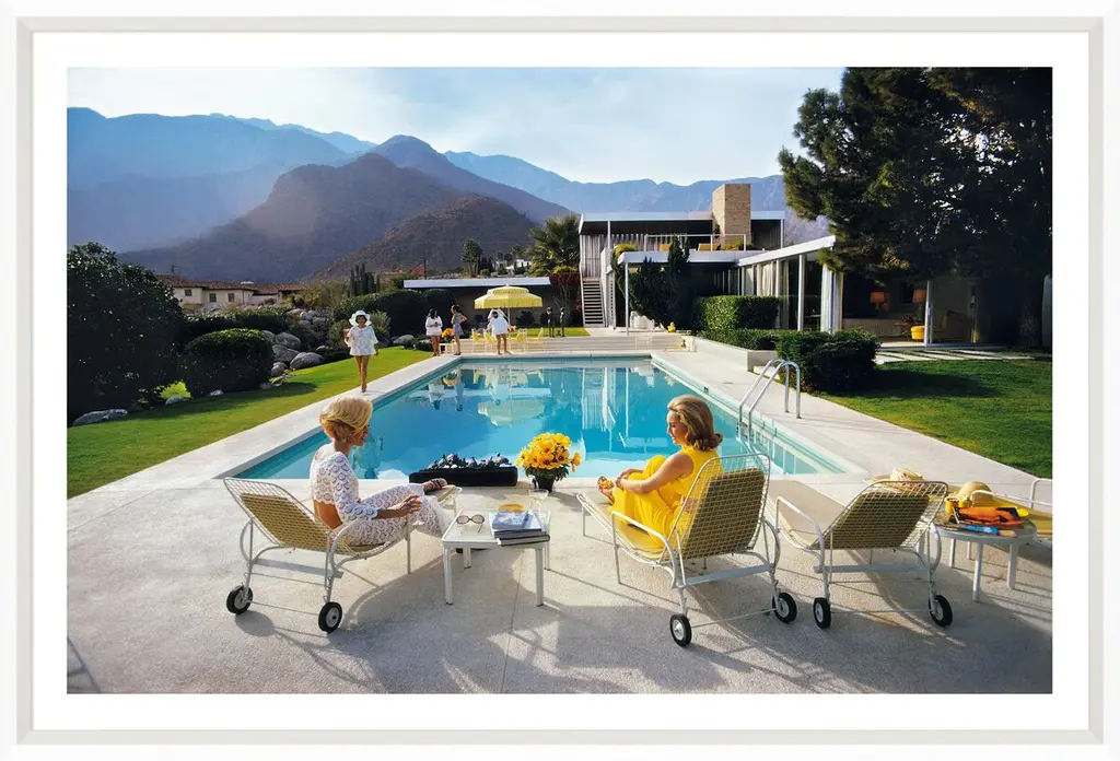 January 1970—Ladies by the pool at the Kaufmann Desert House in Palm Springs, California. From right to left, former fashion model Helen Dzo Dzo Kaptur (in white lace), unknown, Nelda Linsk (in yellow), wife of art dealer Joseph Linsk, and actress Lita Baron (in the white sunhat). The Linsks are the current owners of the house.Hand-selected from American photographer Slim Aarons' classic collection. Aarons is renowned for his evocative photographs of, as he described it, "attractive people doing attractive things in attractive places." Each image is printed from scans of the original negative then mounted on aluminum and faced with museum quality Plexiglas. Please allow approximately 3 to 5 weeks for delivery.Jonathan Adler offers premium quality photographic prints from the Slim Aarons Archive, owned and housed by Getty Images. All photographs are printed and authorized by the Getty Images Gallery, London. Item #26435