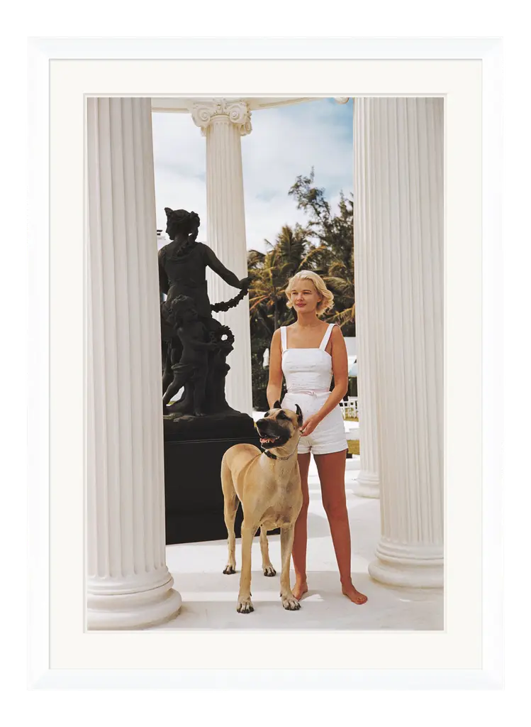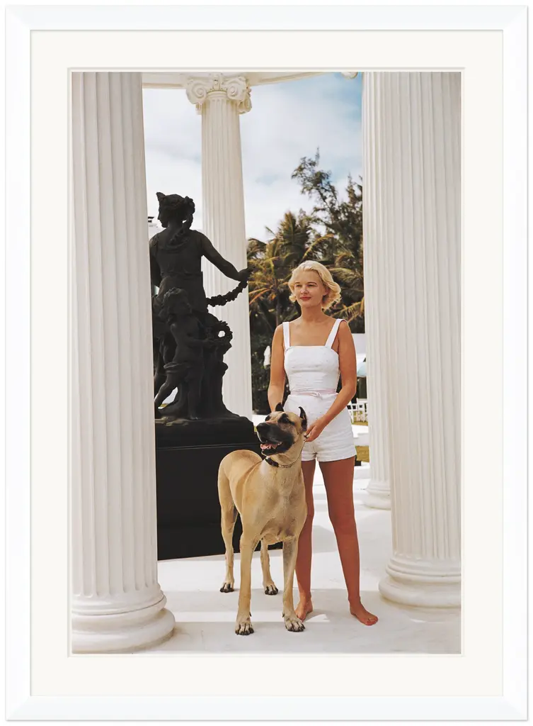 American socialite C.Z. Guest (Mrs Winston F.C. Guest) (1920 - 2003) with a large Great Dane dog, at her Grecian temple pool on the ocean-front estate, Villa Artemis, Palm Beach, Florida, 1955. George 'Slim' Aarons, a WWII army photographer, returned from the war with a mission of this own: to photograph "attractive people doing attractive things in attractive places." From 1947 to 1993, on assignment for Holiday, Life, Vogue and Town & Country, he traveled the world documenting the rich and famous at home and play. Slim's iconic photographs, the best of which are gathered here, provide a rare glimpse into a golden age of wealth, privilege, beauty, and leisure.