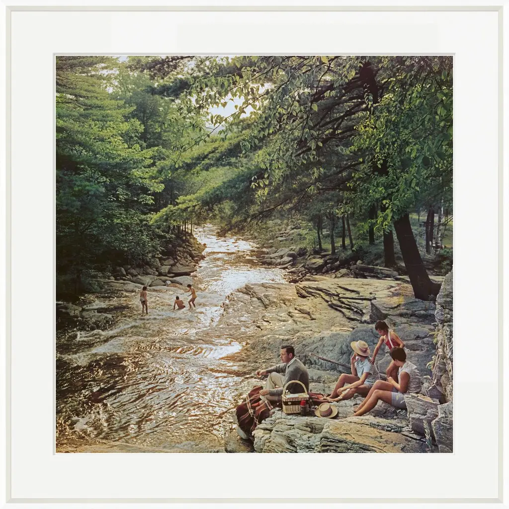 Taken in 1959, this image from legendary photographer Slim Aarons captures a family enjoying a picnic on the bank of the Whiting River near Campbell Falls, MA. Printed on archival paper, this piece arrives framed and ready to hang.