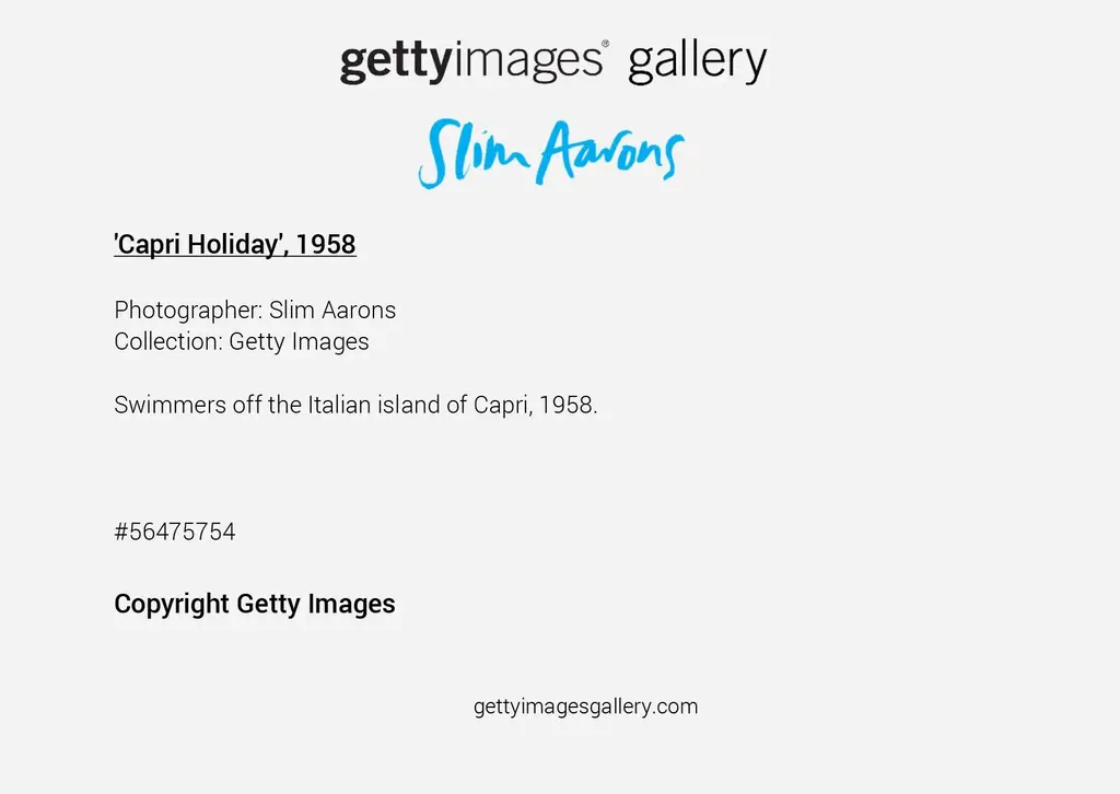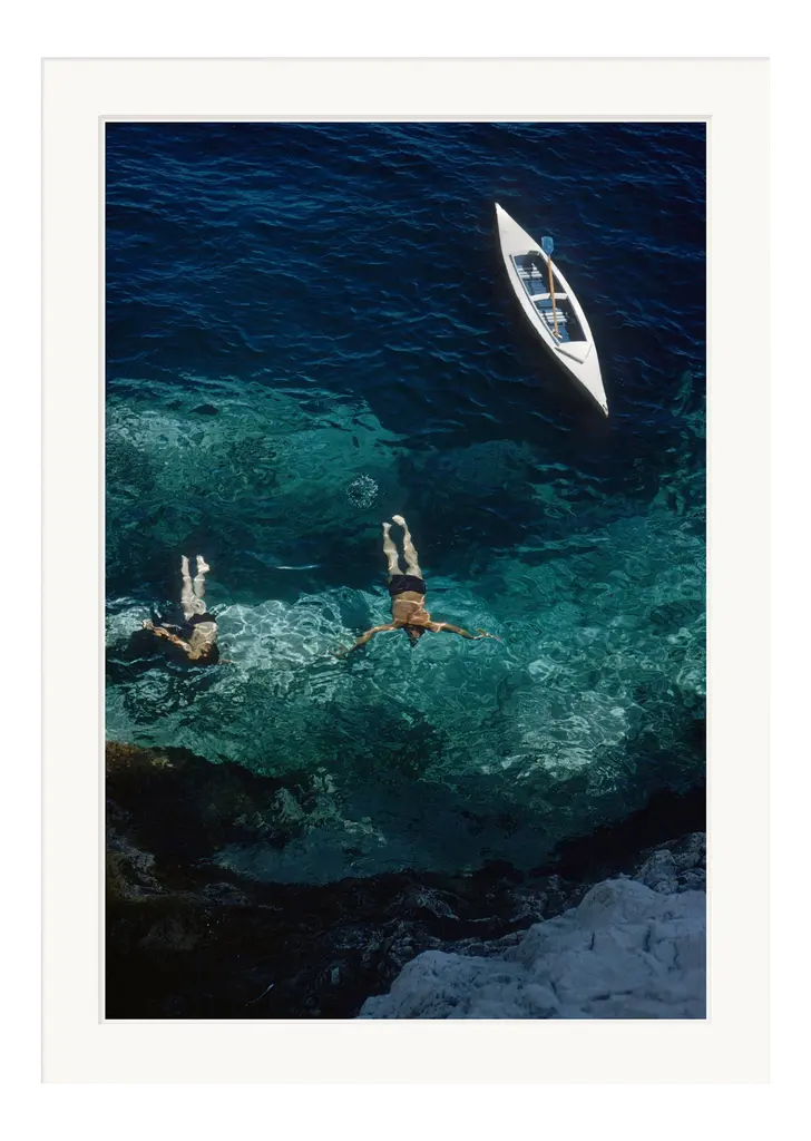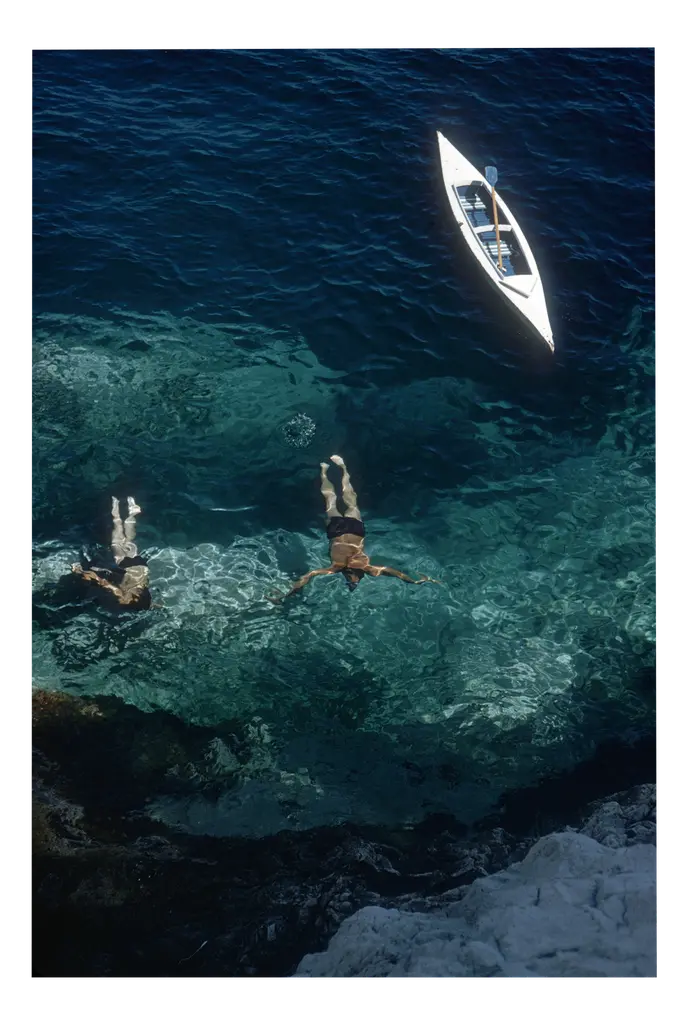 Swimmers off the Italian island of Capri, 1958. George 'Slim' Aarons, a WWII army photographer, returned from the war with a mission of this own: to photograph "attractive people doing attractive things in attractive places." From 1947 to 1993, on assignment for Holiday, LIFE, Vogue and Town & Country, he traveled the world documenting the rich and famous at home and play. Slim's iconic photographs, the best of which are gathered here, provide a rare glimpse into a golden age of wealth, privilege, beauty, and leisure.