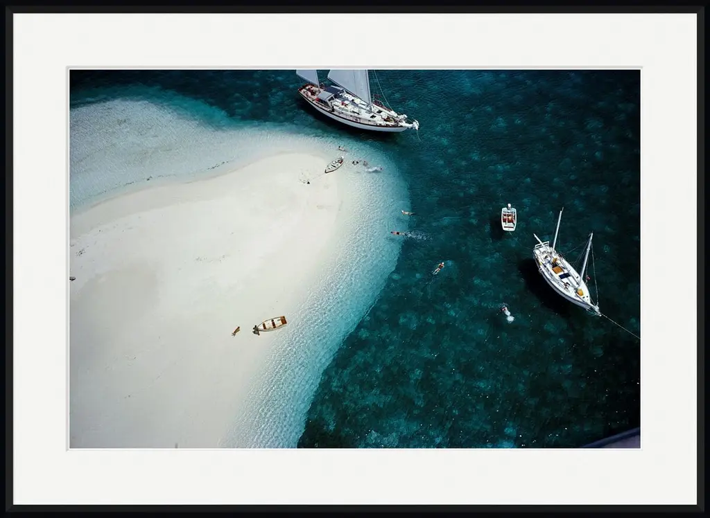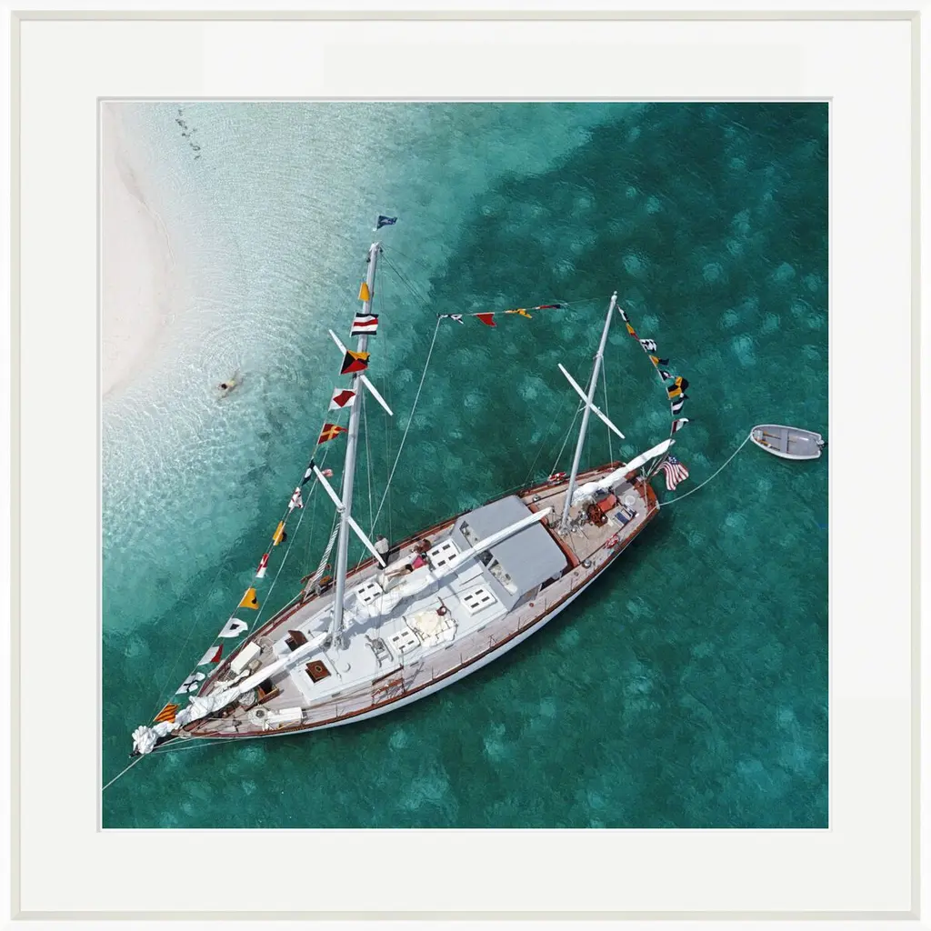 Taken c. 1960, this aerial image from legendary photographer Slim Aarons captures a 68-foot boat anchored off Stocking Island in the Bahamas. Printed on archival paper, this piece arrives framed and ready to hang.