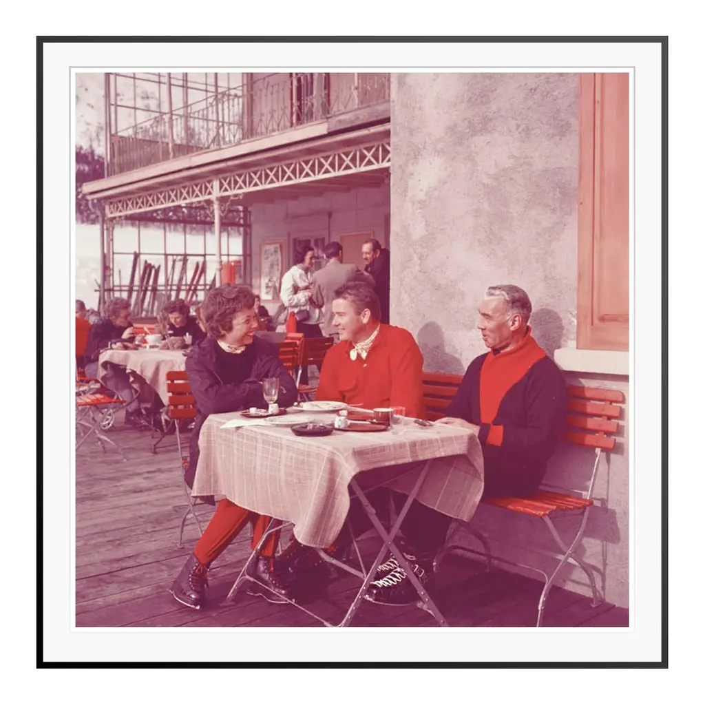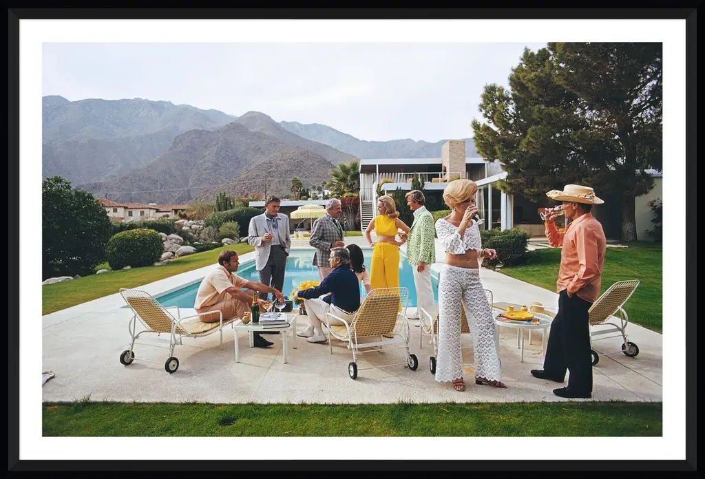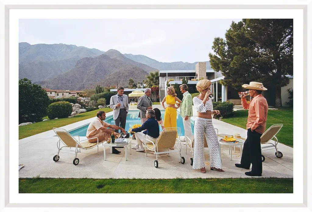 Taken in January 1970, this image from Slim Aarons captures a party (and the breathtaking backyard view) at the Kaufmann Desert House in Palm Springs, which was designed by modernist architect Richard Neutra in 1946. Printed on archival paper, the photograph arrives matted, framed, and ready to hang.