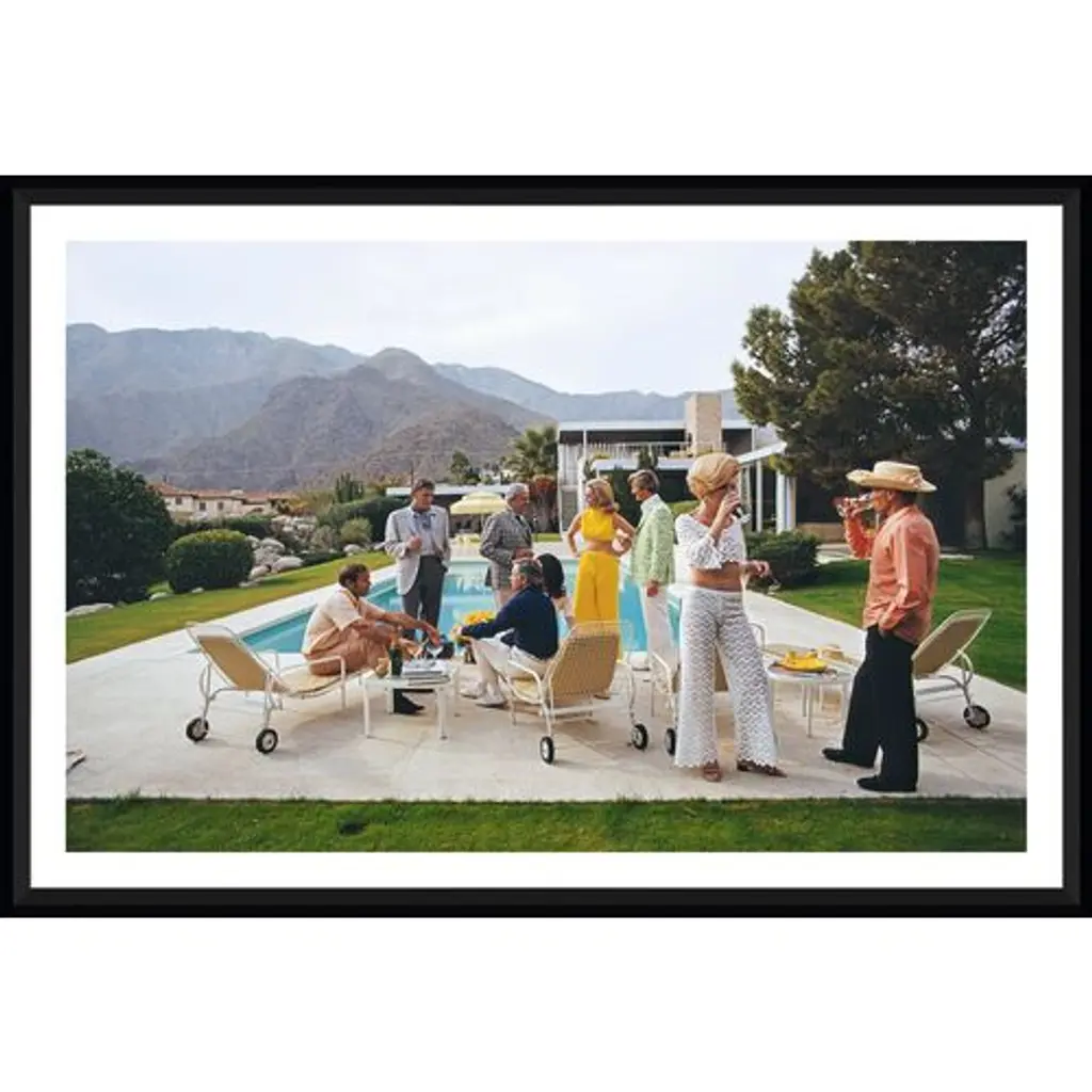Taken in January 1970, this image from Slim Aarons captures a party (and the breathtaking backyard view) at the Kaufmann Desert House in Palm Springs, which was designed by modernist architect Richard Neutra in 1946. Printed on archival paper, the photograph arrives matted, framed, and ready to hang.