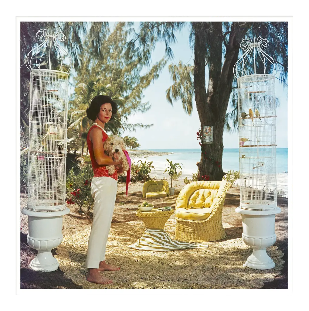 Gloria Schiff, the twin sister of Consuelo Crespi, with her pet dog and pet birds at Lyford Cay in the Bahamas. Hand-selected from American photographer Slim Aarons' classic collection. Aarons is renowned for his evocative photographs of, as he described it, "attractive people doing attractive things in attractive places." Each image is printed from scans of the original negative then mounted on aluminum and faced with museum quality Plexiglas. Please allow approximately 3 to 5 weeks for delivery. Jonathan Adler offers premium quality photographic prints from the Slim Aarons Archive, owned and housed by Getty Images. All photographs are printed and authorized by the Getty Images Gallery, London. Not eligible for discount
