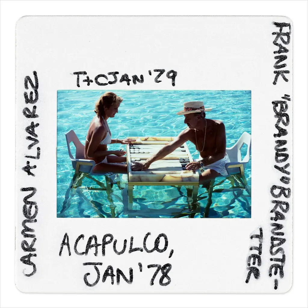 Slim Aarons "Keep Your Cool - Slide" Carmen Alvarez enjoying a game of backgammon with Frank 'Brandy' Brandstetter in a swimming pool at Acapulco, 1978. As an authorized Getty Images Gallery partner, we offer premium quality prints scanned from the original negatives and plates from Getty’s darkroom. Photographic prints are produced through an archival-grade pigment print process on baryta paper to ensure image permanence, tonal depth, and color fidelity. All prints have an embossed Getty Images Archive stamp to the lower right margin and are accompanied by a Certificate of Authenticity from Getty. Please allow approx. 2 - 3 weeks for custom print, production and delivery. This item arrives UNFRAMED. Image is for inspiration purposes only.