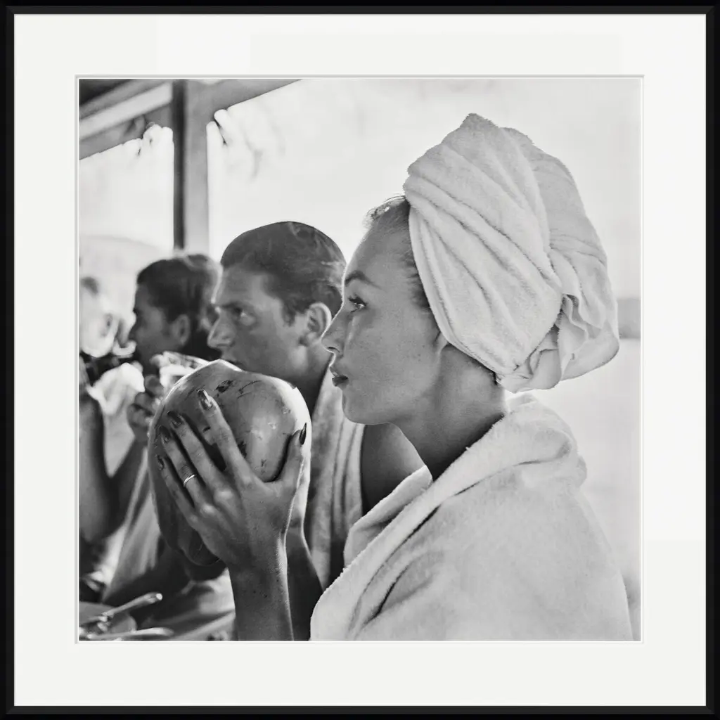 Slim Aarons described his photos as depicting “attractive people doing attractive things in attractive places.” Case in point: this 1953 image of model Liz Pringle drinking from a coconut at Round Hill, a resort in Jamaica she owned with her husband. Printed on archival paper, the photo arrives matted, framed, and ready to hang.
