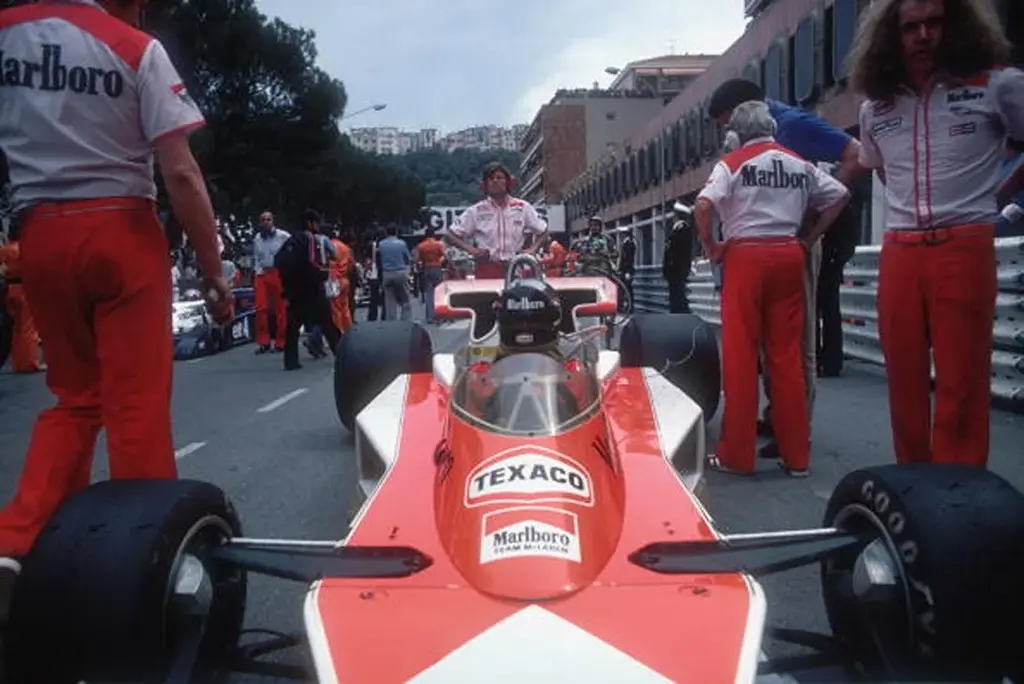 Monaco Grand Prix, 1977 by Slim Aarons 16 x 20". Limited Edition Estate Stamped Print. Edition of 150. Printed Later. "Monaco Grand Prix, 1977" is a beautiful Limited Edition Estate Stamped Digital C-Type print by 20th Century photographer Slim Aarons. Slim Aarons takes the driver's view point in this portrait at the 1977 Monaco Grand Prix, in Monaco. Pit team members are dressed in red, reflecting the team colors, and their sponsorship deal came courtesy of Marlboro cigarettes. from May 1977. Labeled by Maker,Stamped by Maker