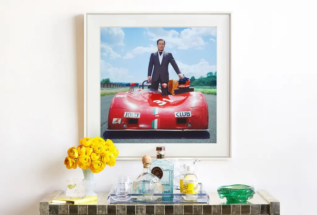 Taken in April 1982, this image from Slim Aarons captures Gabriele D'Annunzio, Prince of Montenevoso and the chief test driver for Firestone International, showing off his red Lola racing car. Printed on archival paper, the photo arrives framed and ready to hang.