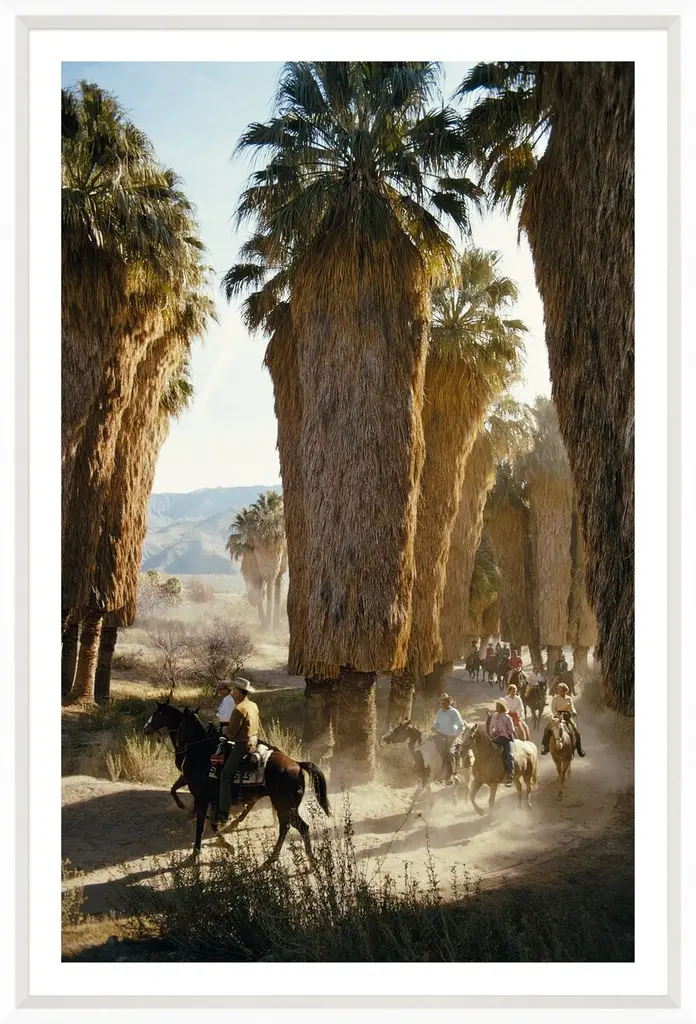 Taken by legendary photographer Slim Aarons in January 1970, this image captures a group of early-morning riders as they move through Andreas Canyon in Palm Springs. Printed on archival paper, the photo arrives matted, framed, and ready to hang.