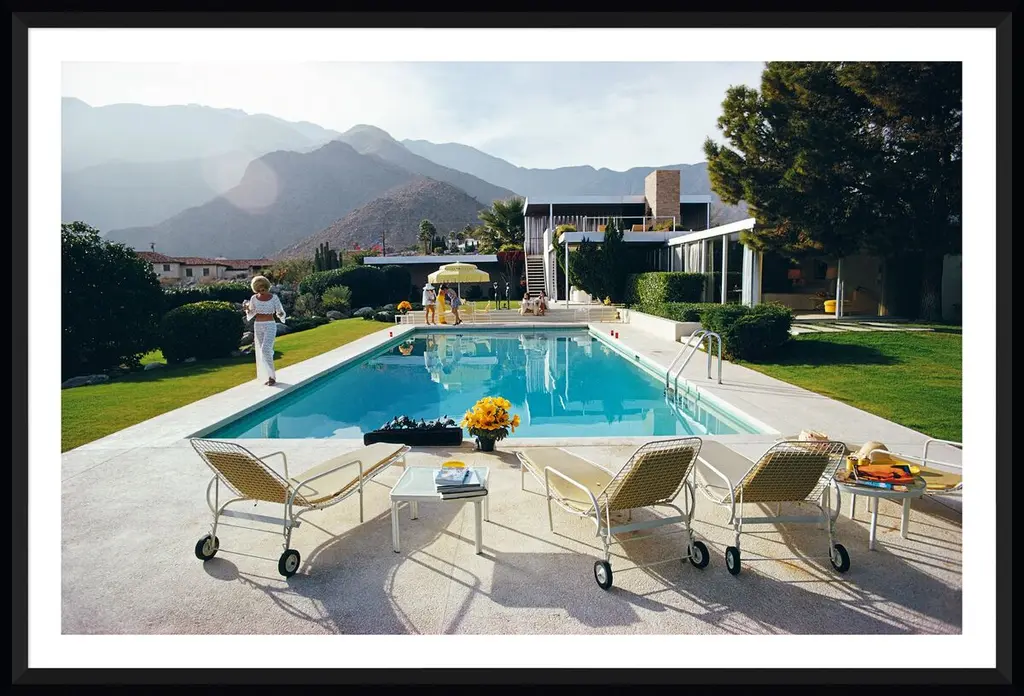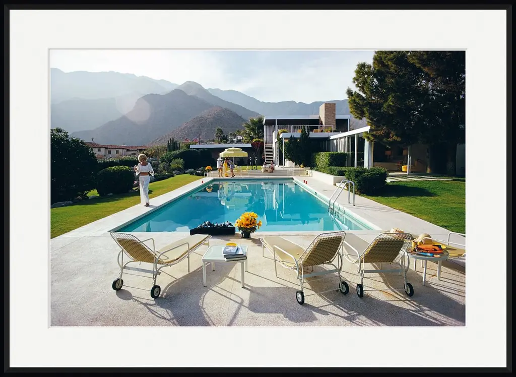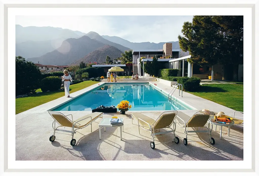 One of Slim Aarons's most iconic images, this was taken in January 1970 at the Kaufmann Desert House in Palm Springs, which was designed by modernist architect Richard Neutra in 1946. Printed on archival paper, it arrives framed and ready to hang.
