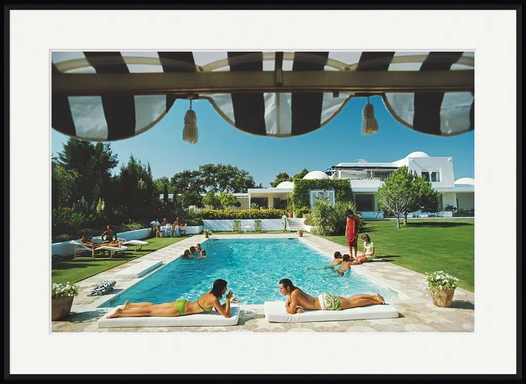 Taken in August 1975, this image from Slim Aarons captures a group of sunbathers around a pool in Sotogrande, Spain. Printed on archival paper, the image arrives matted, framed, and ready to hang.