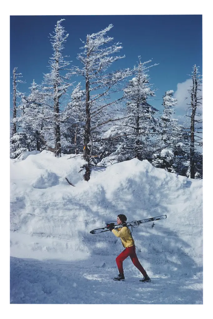 March 1962—A skier at the Stowe Mountain Resort, Vermont, USA. Hand-selected from American photographer Slim Aarons' classic collection. Aarons is renowned for his evocative photographs of, as he described it, "attractive people doing attractive things in attractive places." Each image is printed from scans of the original negative then mounted on aluminum and faced with museum quality Plexiglas. Please allow approximately 3 to 5 weeks for delivery. Jonathan Adler offers premium quality photographic prints from the Slim Aarons Archive, owned and housed by Getty Images. All photographs are printed and authorized by the Getty Images Gallery, London. Not eligible for discount
