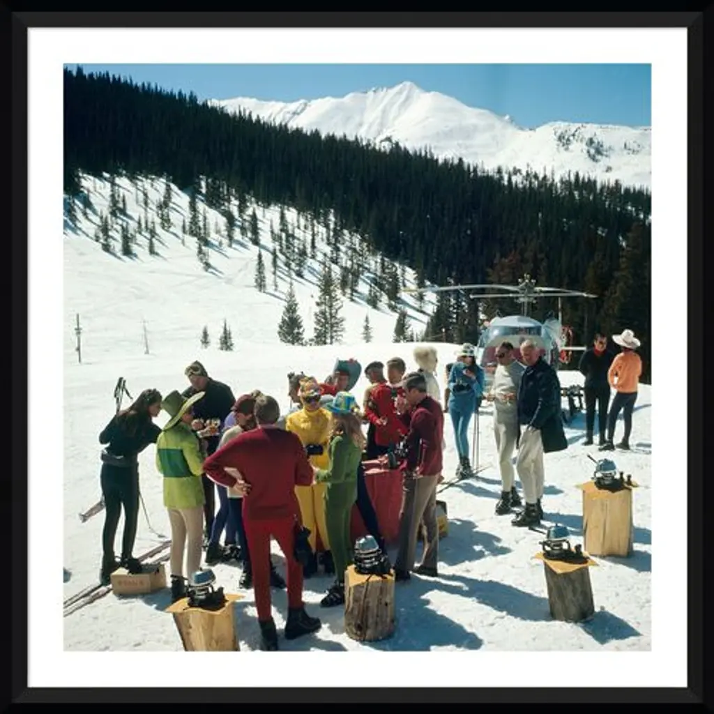 Taken in 1967, this image from legendary photographer Slim Aarons captures a stand-up fondue picnic for skiers in Aspen. Printed on archival paper, the photo arrives framed and ready to hang.