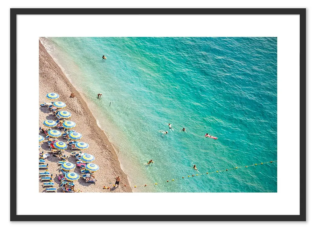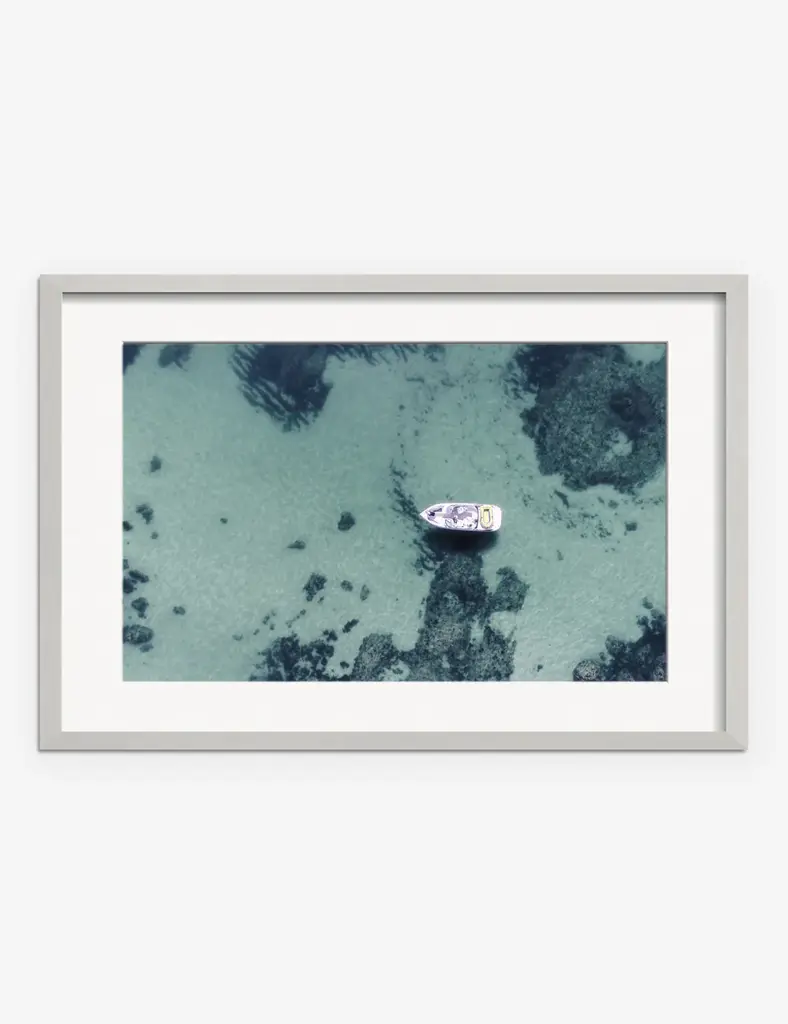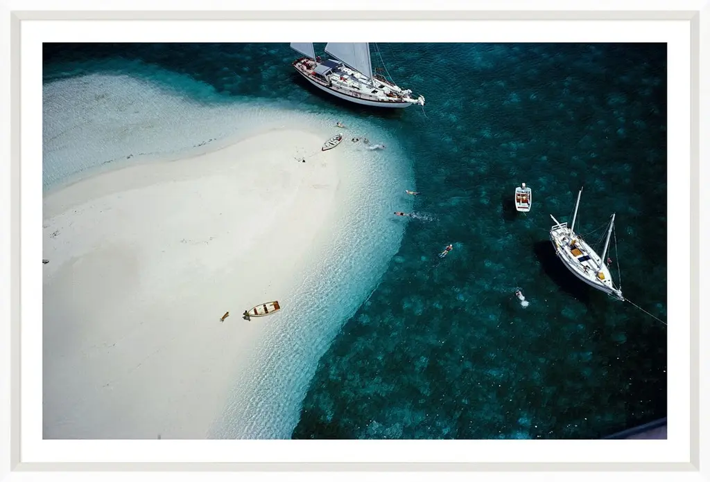 This 1964 image from the legendary Slim Aarons depicts from above a group of people swimming next to a ketch off Stocking Island in the Bahamas. Printed on archival paper, the photo arrives matted, framed, and ready to hang.