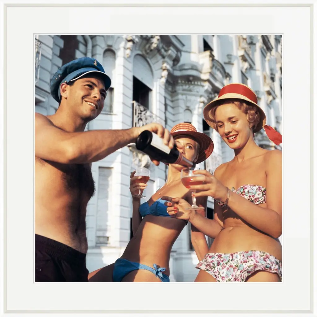 Slim Aarons described his photos as depicting “attractive people doing attractive things in attractive places.” Case in point: this image, taken New Year's Day 1958, of three bathing-suit-clad revelers outside the Carlton Hotel in Cannes. Printed on archival paper, the photo arrives matted, framed, and ready to hang.