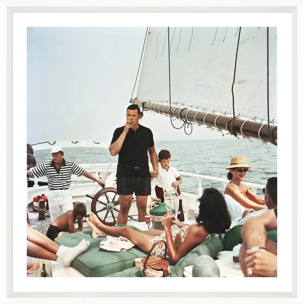 Slim Aarons described his photos as depicting “attractive people doing attractive things in attractive places.” Case in point: this April 1966 image of friends on a yacht in the Bahamas' exclusive Lyford Cay. Printed on archival paper, the photo arrives matted, framed, and ready to hang.
