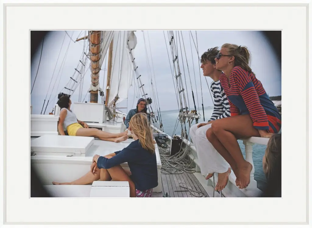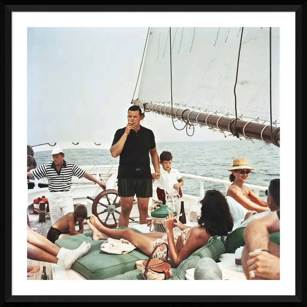 Slim Aarons described his photos as depicting “attractive people doing attractive things in attractive places.” Case in point: this April 1966 image of friends on a yacht in the Bahamas' exclusive Lyford Cay. Printed on archival paper, the photo arrives matted, framed, and ready to hang.