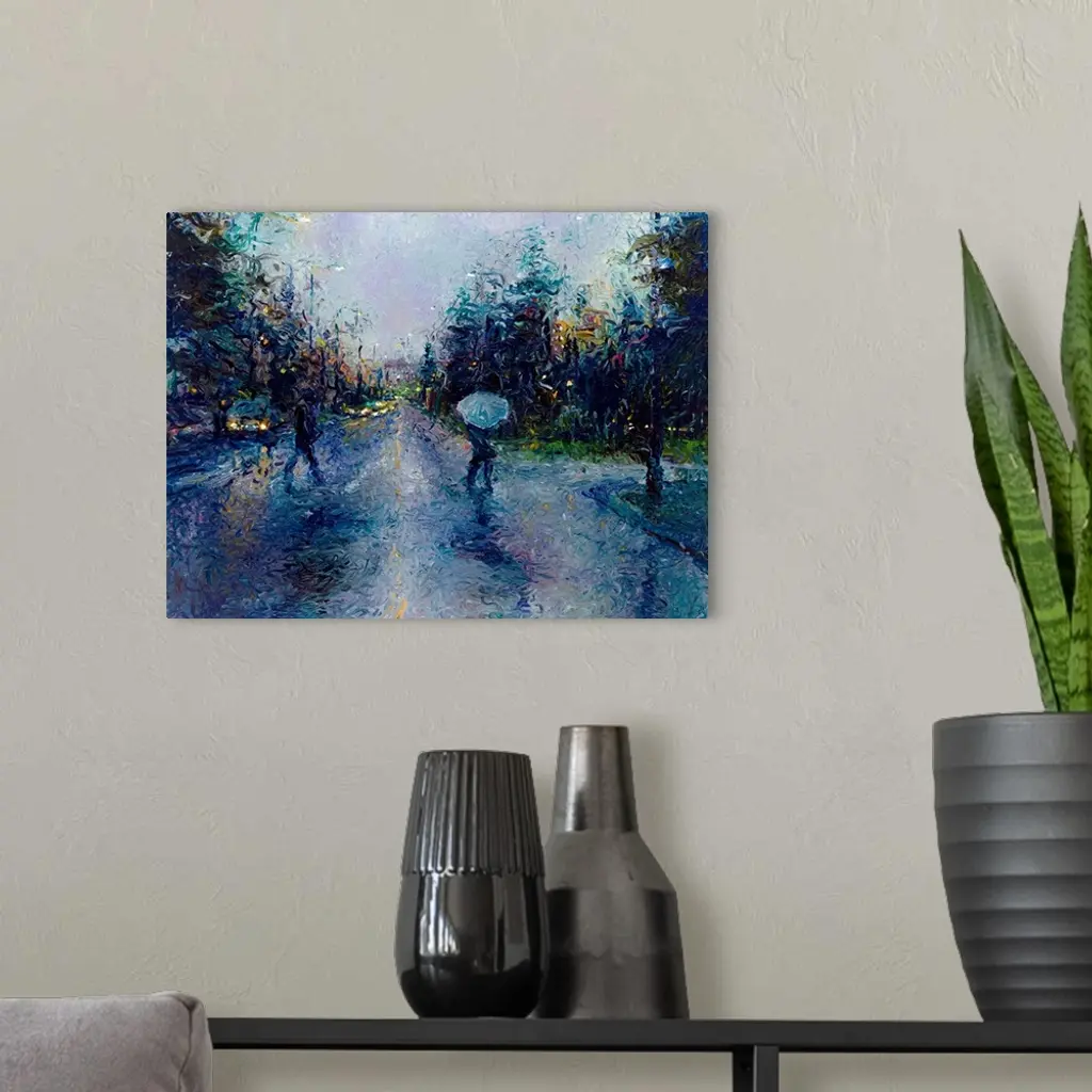 Brightly colored contemporary artwork of people crossing a crosswalk in the rain.