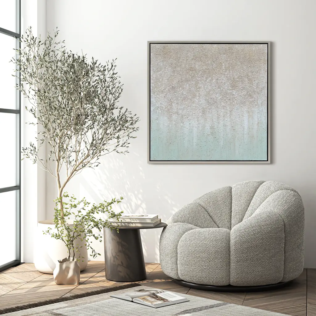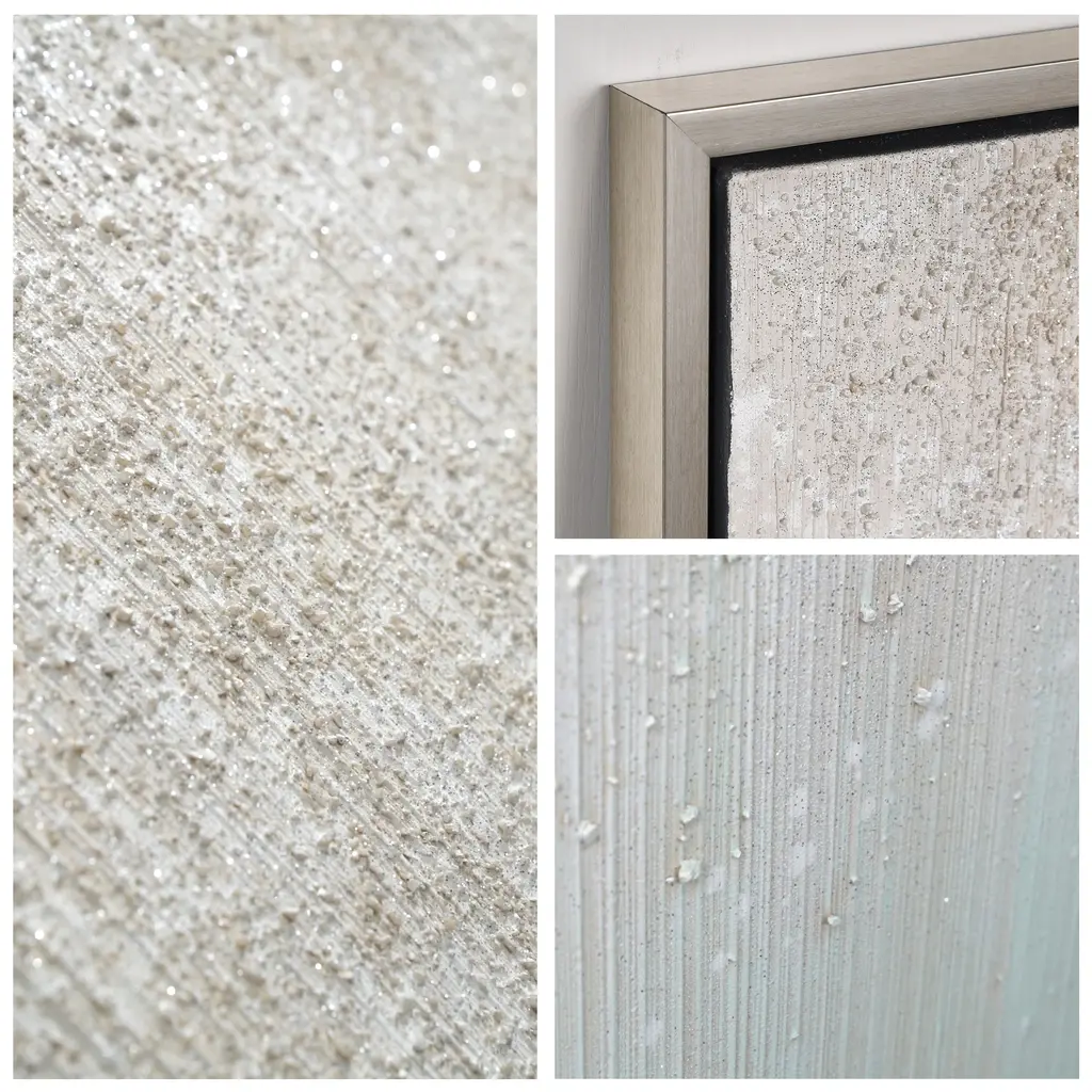Artist Martin Edwards loves the texture and feel of paint and the sensuous beauty of color and tries to make the most of these two elements in his original works of art. This specific style shouts movement and mood as it moves across the canvas and the color only serves to intensify the emotion displayed. This piece uses subtle variations in technique and metallic color combinations to display a three-dimensional, hand painted, piece of art that displays an abstract silver image image that has been embellished with glitter. Surrounding this work of art is a strong, champagne frame. 2 D-rings are affixed to the back of the artwork so it is ready to hang in a vertical orientation!