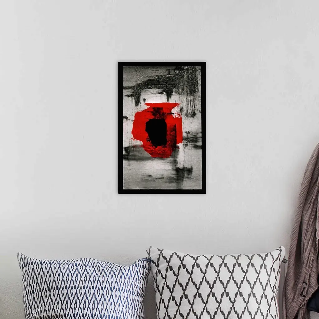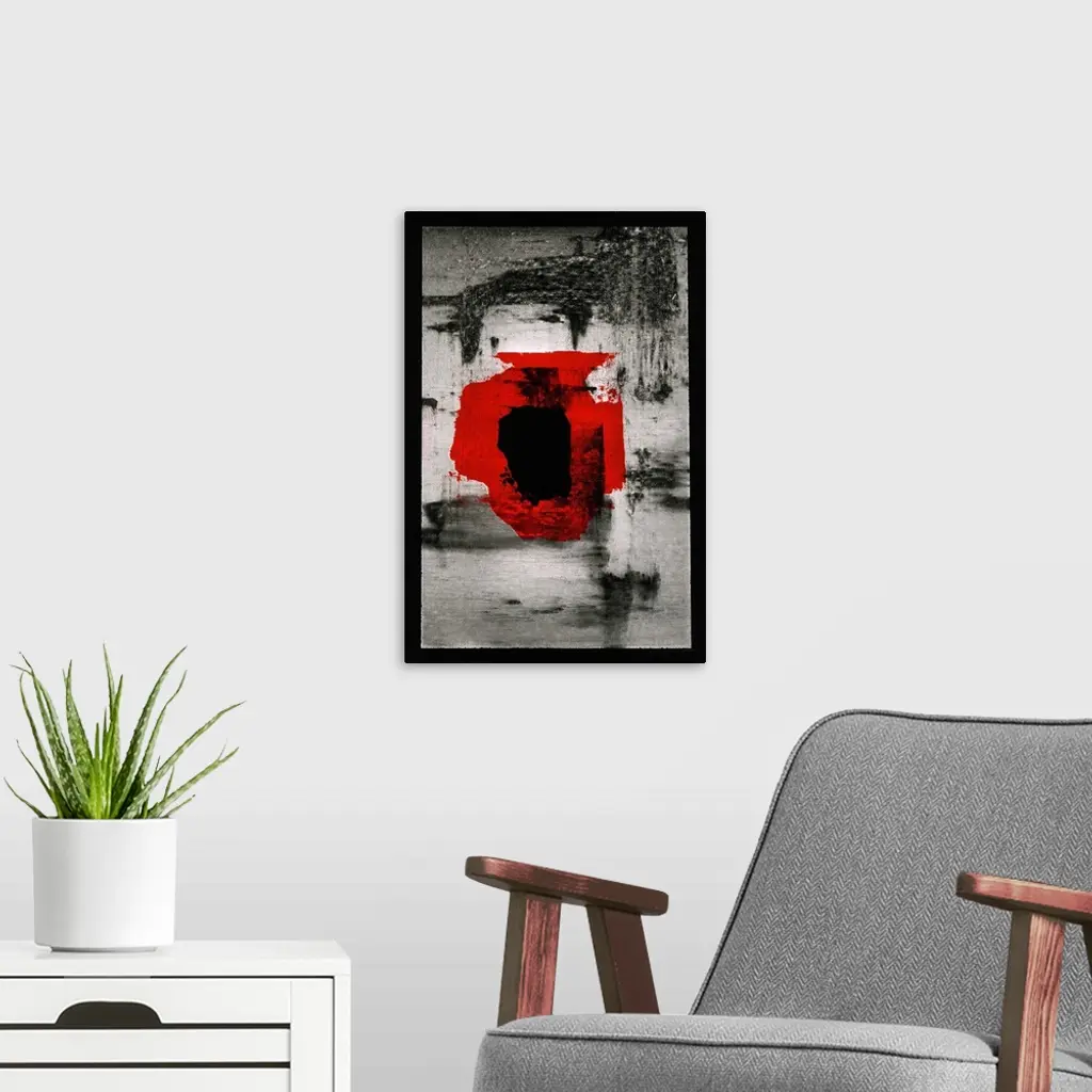 Contemporary abstract painting made with dark black and gray hues, a bright red shape in the middle, and a solid black boarder.