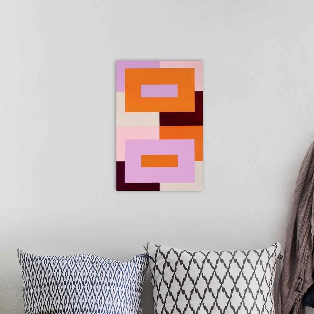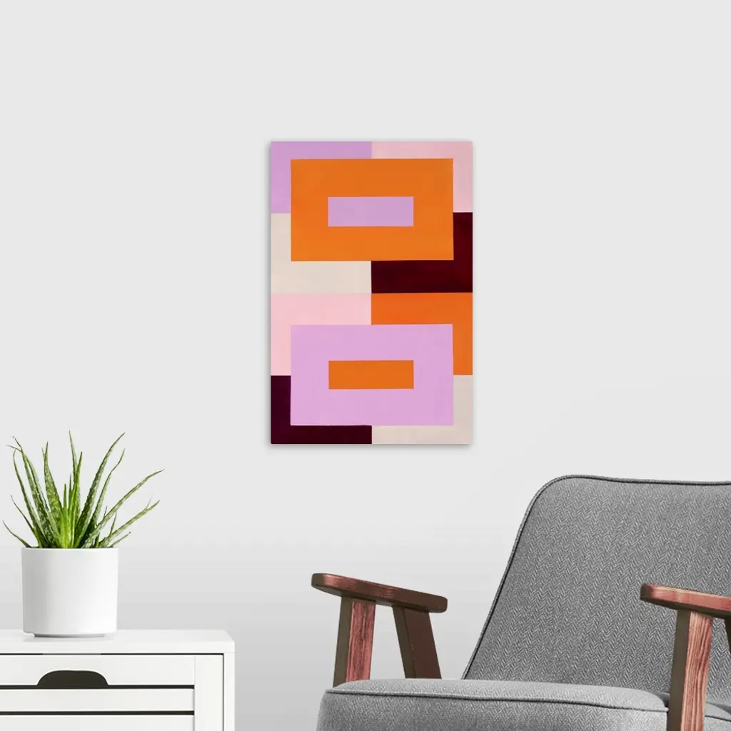 Geometric abstract painting that has a background made out of colorful squares and two large rectangles on top with a skinny rectangle inside each, all made up with orange, pink, purple, and burgundy hues.
