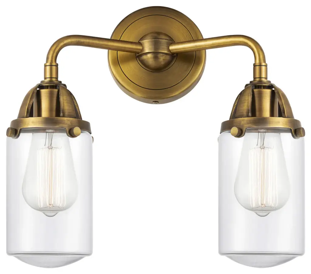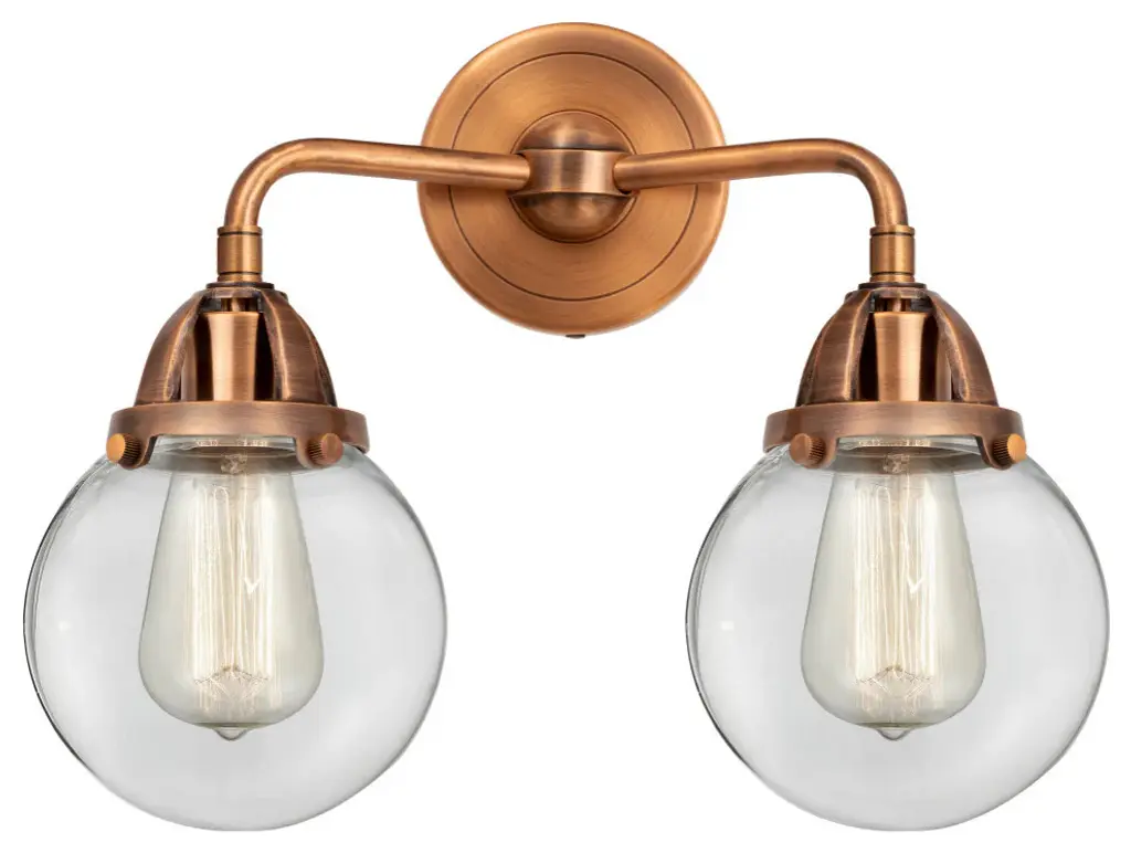The Nouveau 2 is a highly detailed work of art that draws the eyes into its base and arm detail. The true show stopping piece is the beautifully curved glass shade that''s sure to wow you and guests alike.Features:Fixture can be hung with bulbs facing up or down4.5 inch 2mm heavy cast backplateDistance from outlet opening to top of fixture 2.25 inchesRated for 100 watt maximum per socketUL/CUL Damp RatedCompatible with Incandescent, LED, Fluorescent and Halogen bulbsNumber of Bulbs: 2Bulb Wattage: 3.5Bulb Type: LEDBulb Included: IncludedVoltage: 120Finish: Antique Copper, Clear