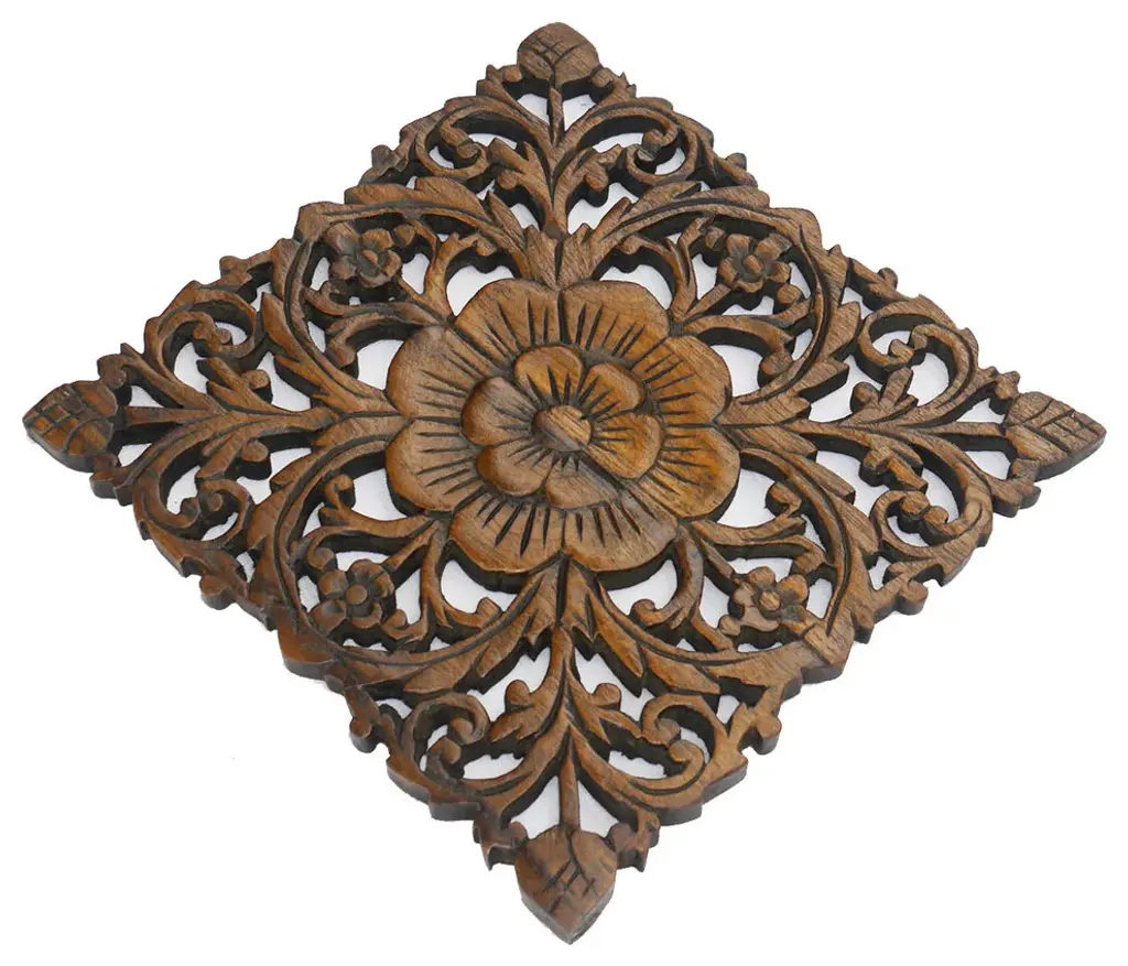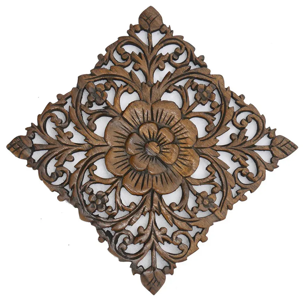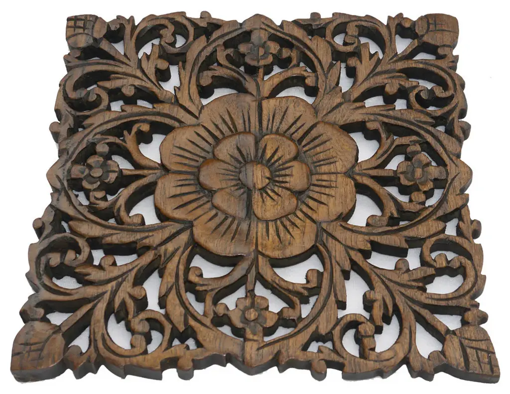 This oriental carved lotus wood plaque will add a captivating elegance to your room. Made from teak wood carved by fine Thai craftsman. Discover this exotic experience with your purchase of one or more of these magnificent treasures. SIZE - WEIGHT - COLOR - MATERIAL Height: 12 InchesWidth: 12 InchesThickness: 0.5 InchesWeight: 1.5 lbs.Material: Teak Wood